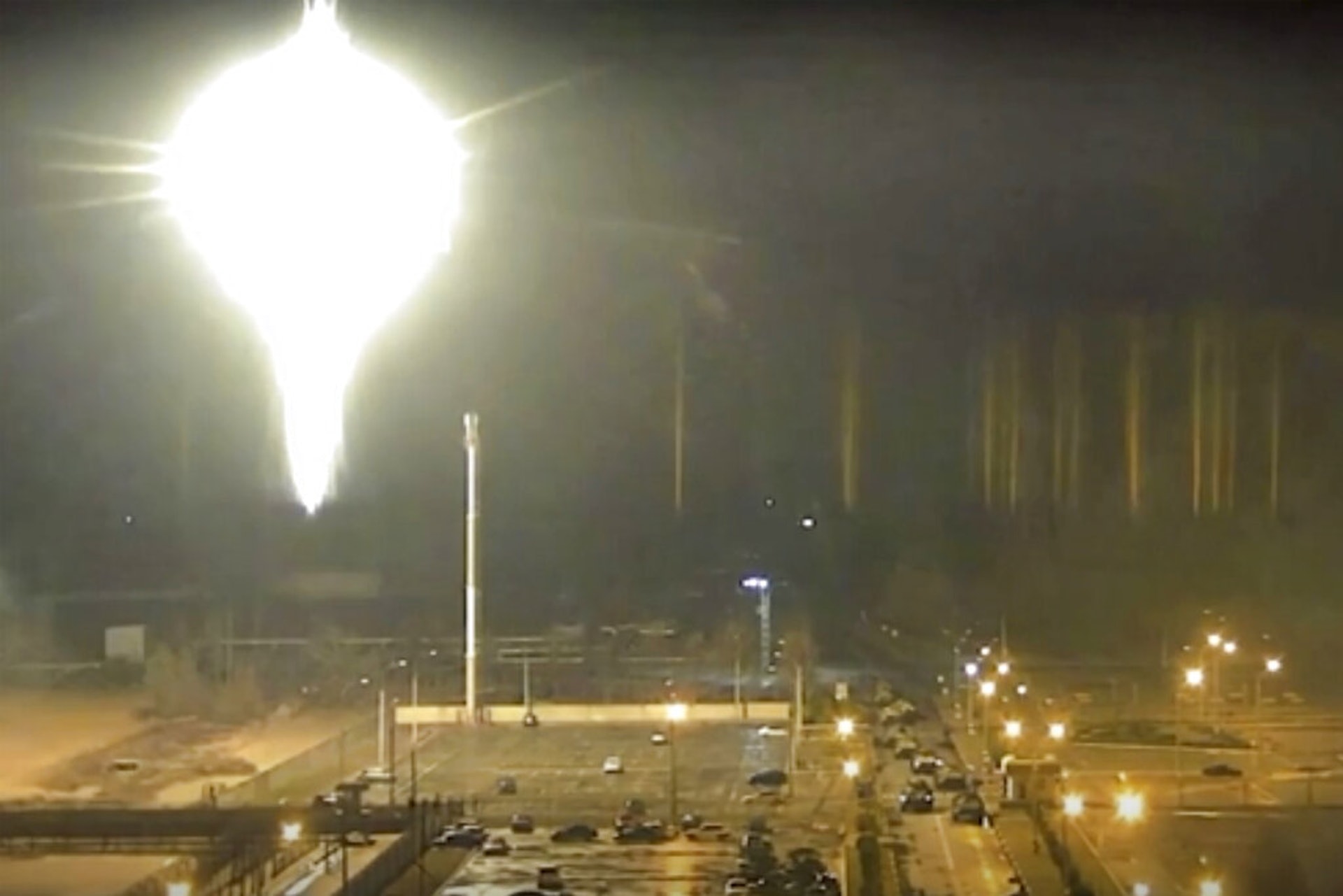 7 ^* j$ Z$ @- F3 H% l. h公仔箱論壇扎波羅熱核電廠疑似被攻擊時的狀況,照片可見閃光物墮落至核電廠的位置。(美聯社)