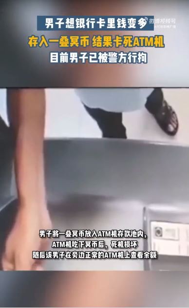 內地發生一宗離譜事件,一名男子為增加帳號餘額,透過ATM(自動櫃員機)存款時塞了滿滿的冥紙,結果不僅把ATM弄壞,還當場被抓走,引起社會熱議。(微博影片截圖)
