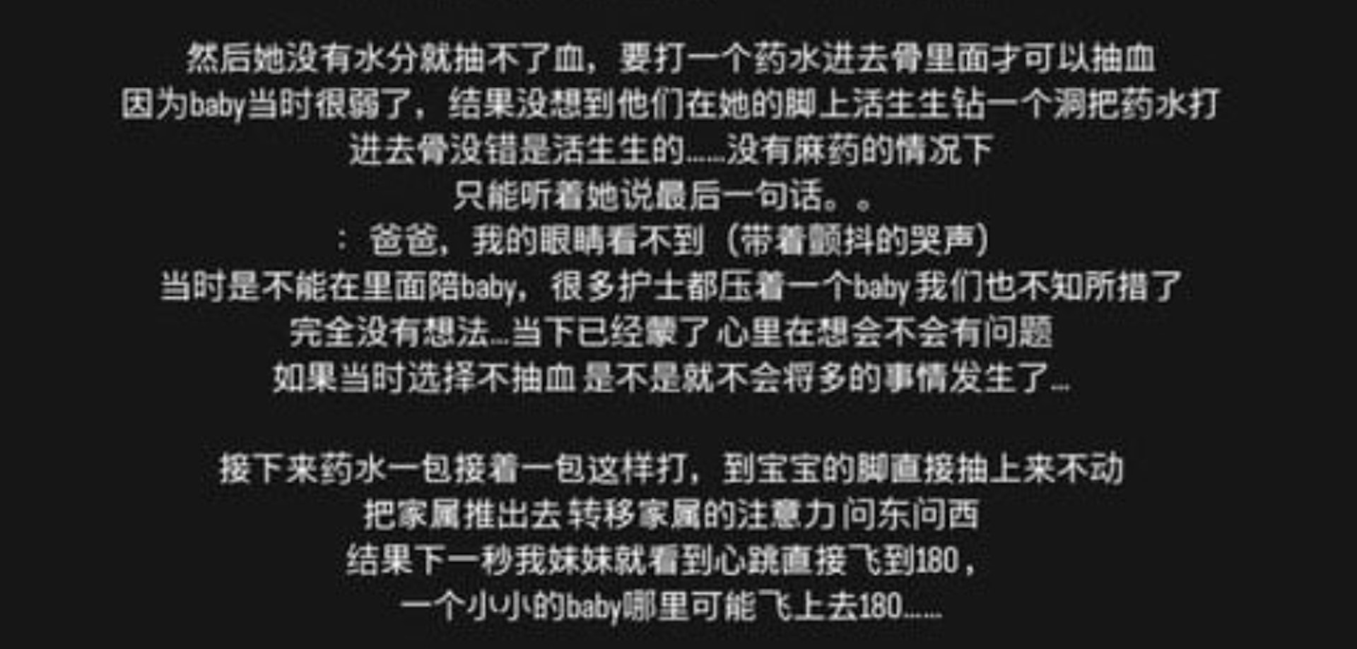 據《中國報》報道,3歲女童的母親是一名網紅,她在IG發限時動態說明整個過程,醫生一開始說女童體內水分不足,需注射藥水才能抽血檢驗,而且還把藥水打進骨頭裡面,「沒有麻藥的情況下」。她說,當時女兒顫抖的邊哭邊說:爸爸我的眼睛看不到了……