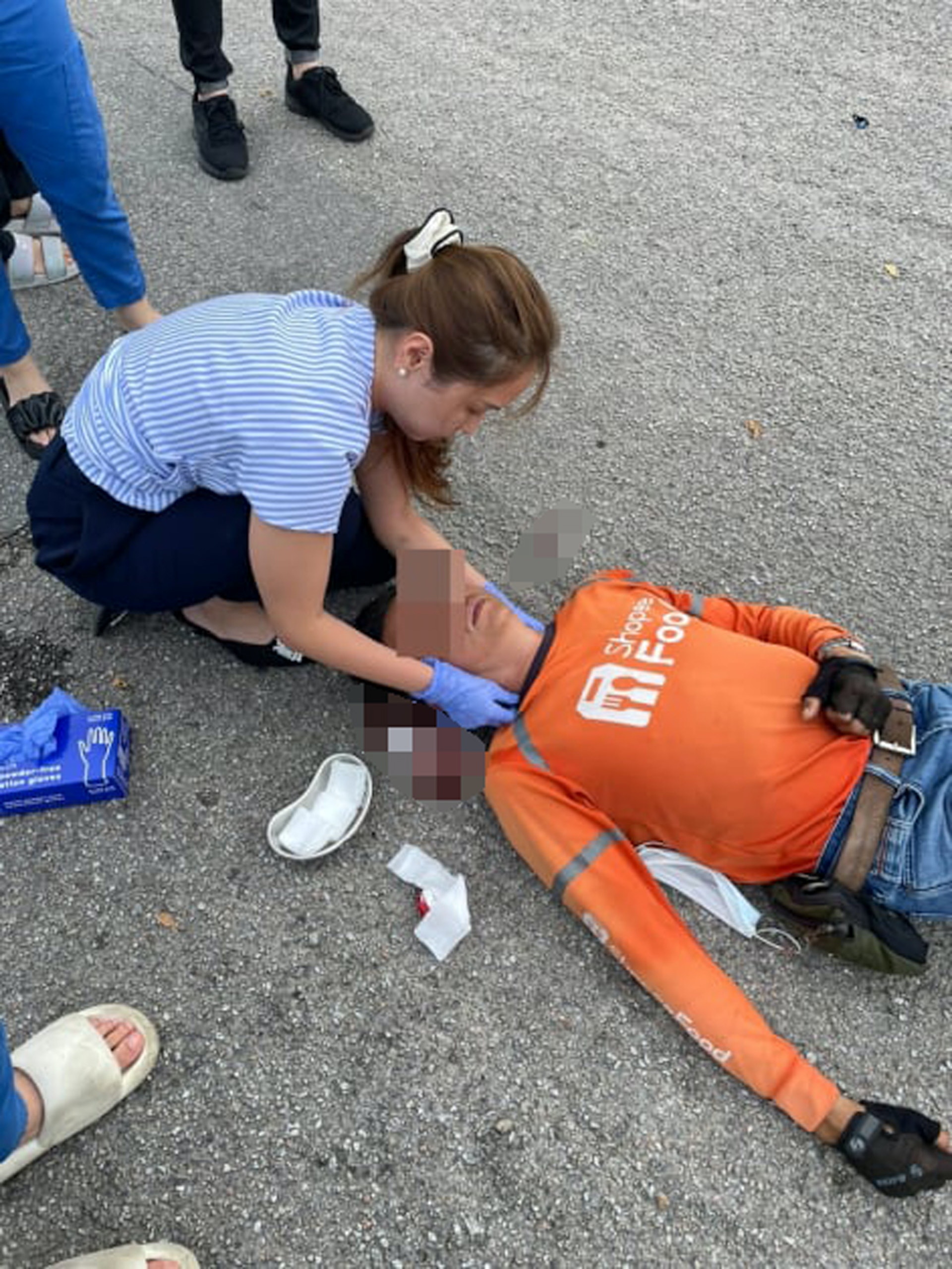 " e! P' {$ q4 v, k: z7 Y6 u+ g女醫生趕到車禍現場,衝出馬路為外賣員急救。(fb圖片)