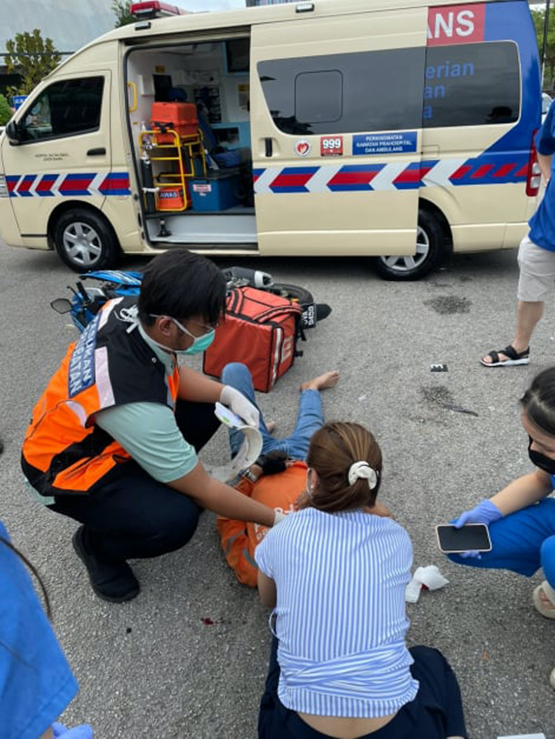 3 O- }4 G6 X, m3 S4 P. zwww2.tvboxnow.com醫者父母心,當然想大家平平安安過年。馬來西亞1名外賣員近日騎電單車送餐時與私家車發生擦撞,他拋跌路上受傷倒臥血泊中。此時附近診所有女醫生趕到現場為外賣員止血急救,更陪伴在旁等到救護車到場,事件被網民爆讚。女醫生接受當地傳媒訪問時,還原現場情況,又指她當時一心想救人,不想有人在新年出事,還提醒民眾新年路面車多,要小心出行。