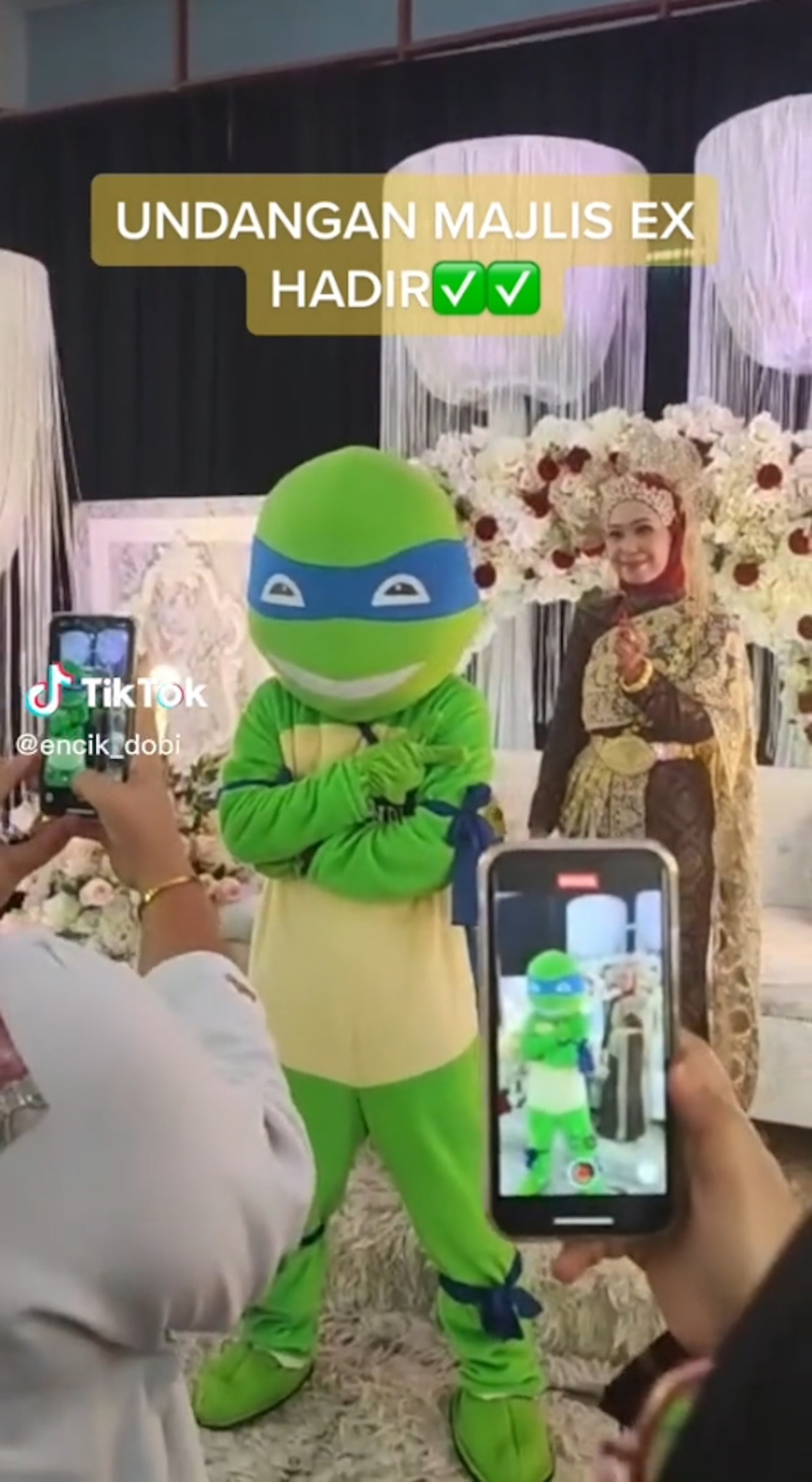 一名馬來西亞的男子與女友愛情長跑8年,但最後不幸以分手收場,沒多久後前女友嫁給了另外一人,他雖然感到十分悲傷,卻還是選擇去參加婚禮,不過他沒有去大鬧會場,而是穿上「忍者龜」布偶裝,以特別的方式為這天留下紀念。(TikTok@encik_dobi)
