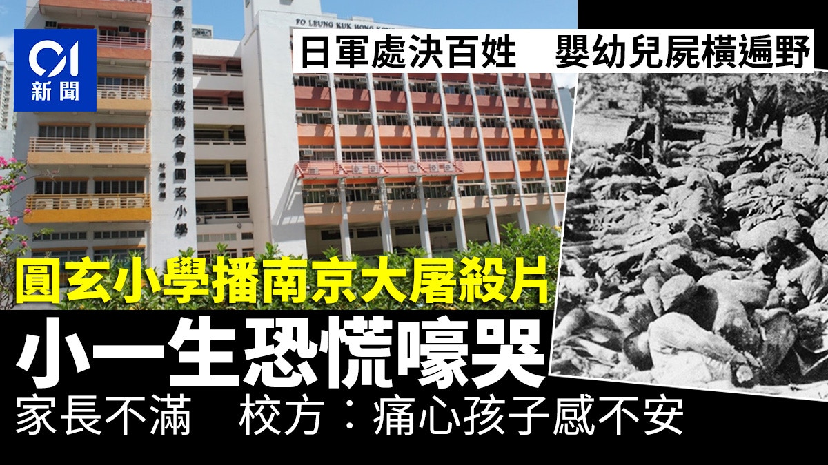 今年是南京大屠殺84周年,教育局上月底去信全港校長,建議學校在下周一(13日)「南京大屠殺死難者國家公祭日」。網上流傳,屯門直資小學保良局香港道教聯合會圓玄小學,上周四(9日)在小一德育課課堂,有教師曾向學生播放「南京大屠殺」的戰爭真實片段,包括日軍處決百姓、嬰幼兒屍橫遍野的場面,不少學生觀看完短片後,恐慌嚎哭,惹起大批家長不滿。