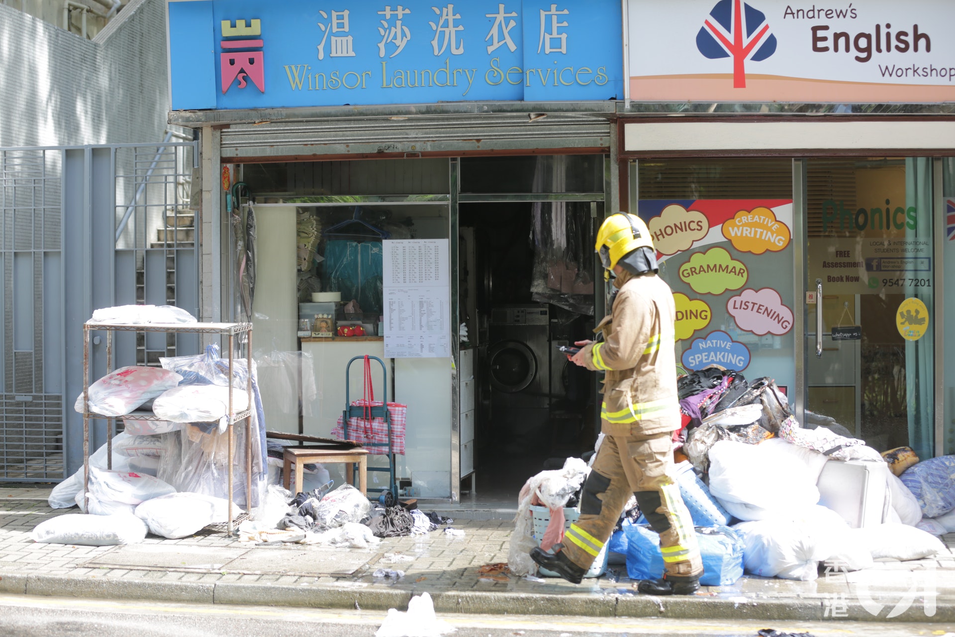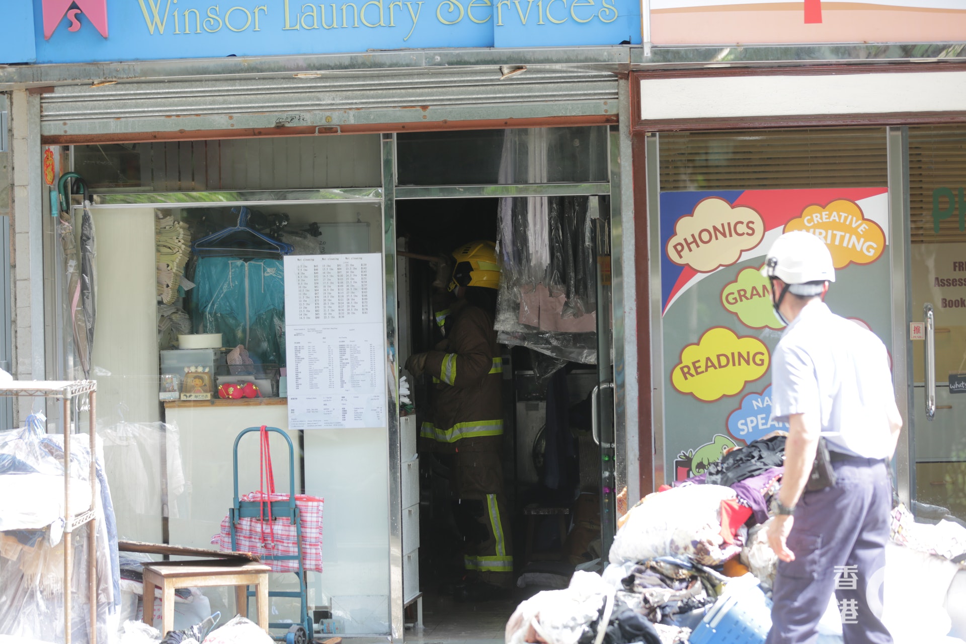 至於洗衣店的女店長頭髮及眉毛都有輕微燒焦,她拒絕送院。(黃偉民攝)