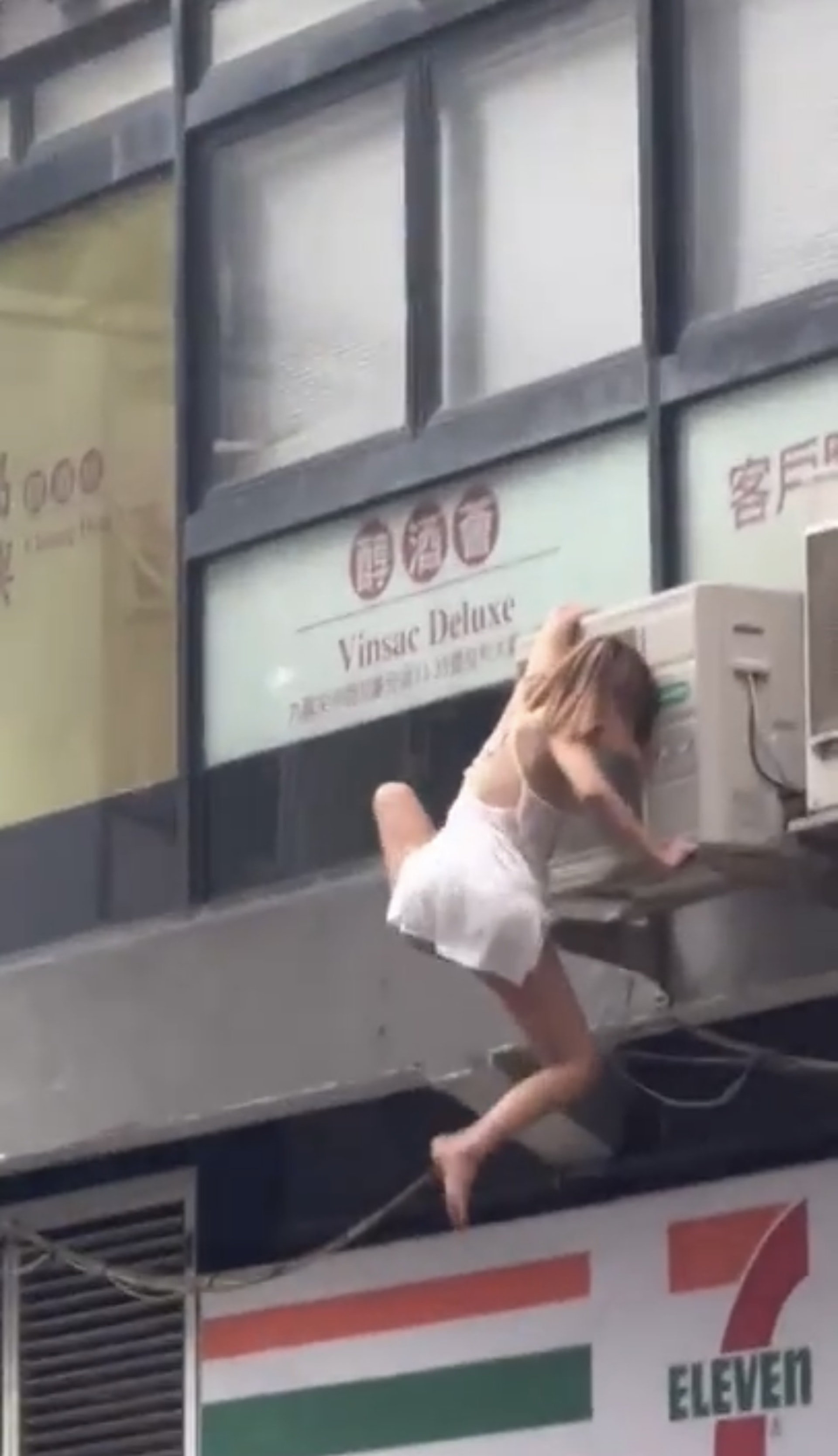 , G6 G9 F# e/ n* p公仔箱論壇一名頭染金髮,身穿白色性感內衣的女子,蹲於於加拿分道及寶勒巷交界的發利大廈外牆簷篷。(網上影片截圖)& m+ j2 n- F; G, P m! u0 V