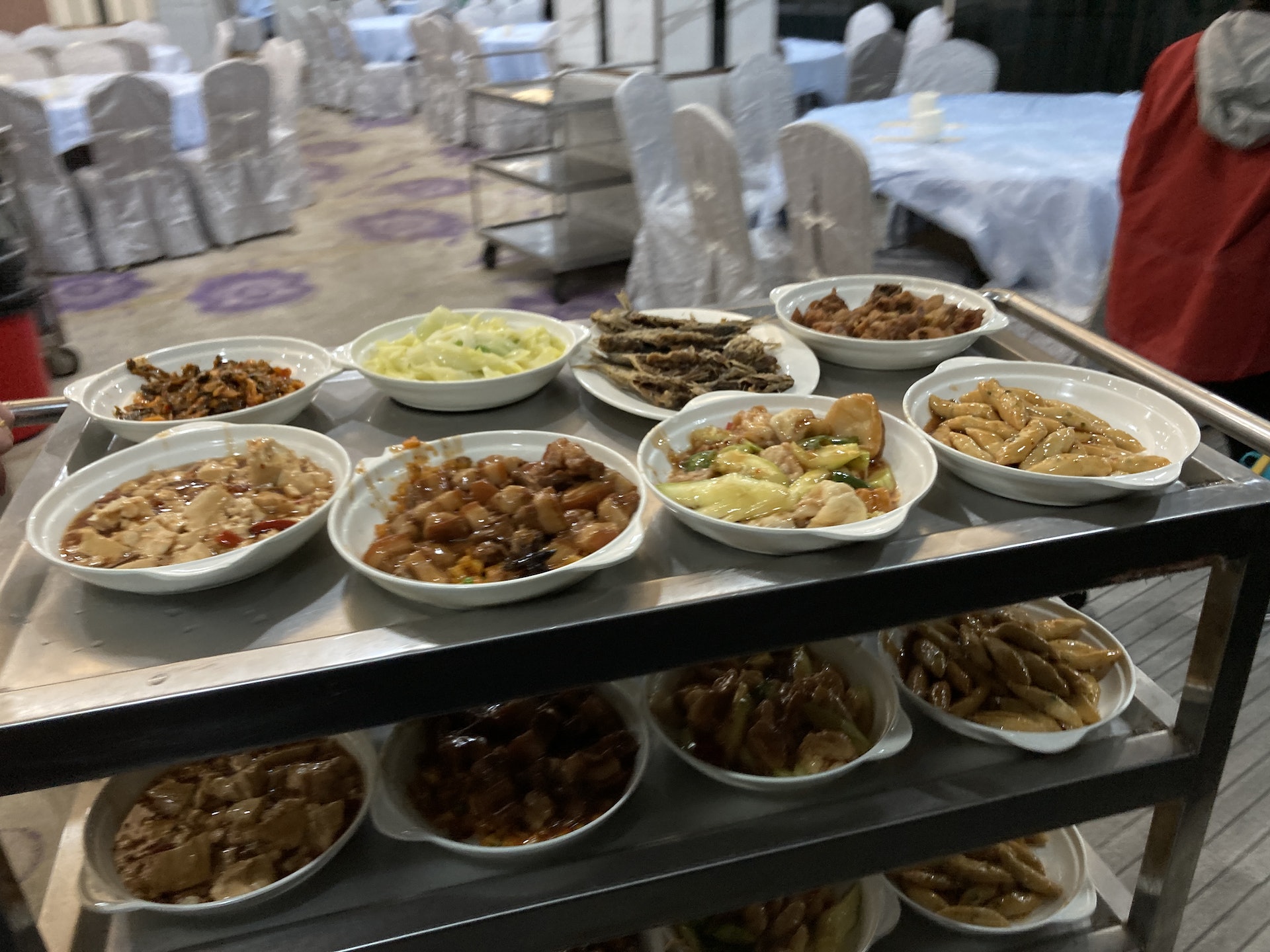 3 @8 l5 ?/ e5 M/ L大批團友甫入坐,酒樓女工即用餐車推來多碟餸菜端上桌。(楊凱力攝)