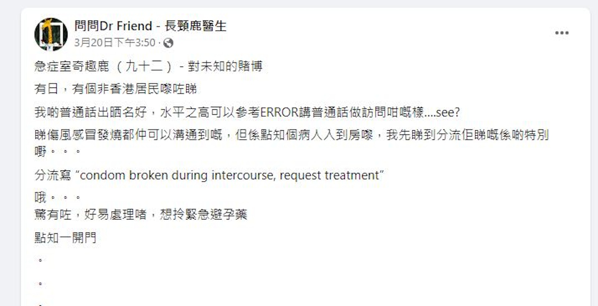 得悉藥費逾萬元,男子不斷問愛滋病症狀及風險,「長頸鹿醫生」無奈重複,「機會低還低,老定還老定,風險唔係零,唔係零,風險唔係零,唔係零」。討論無果,男子最後決定「博一博,唔食藥,唔驗喇」,並問「我還需要畀診金嗎?」,讓「長頸鹿醫生」嚇到無語,心想「作為醫護我哋唔會做道德審判,你尋歡有無畀錢我就唔知,不過……而家尋完知,唔會反而唔使畀下話?」。公仔箱論壇$ J3 c4 T# a' m5 m