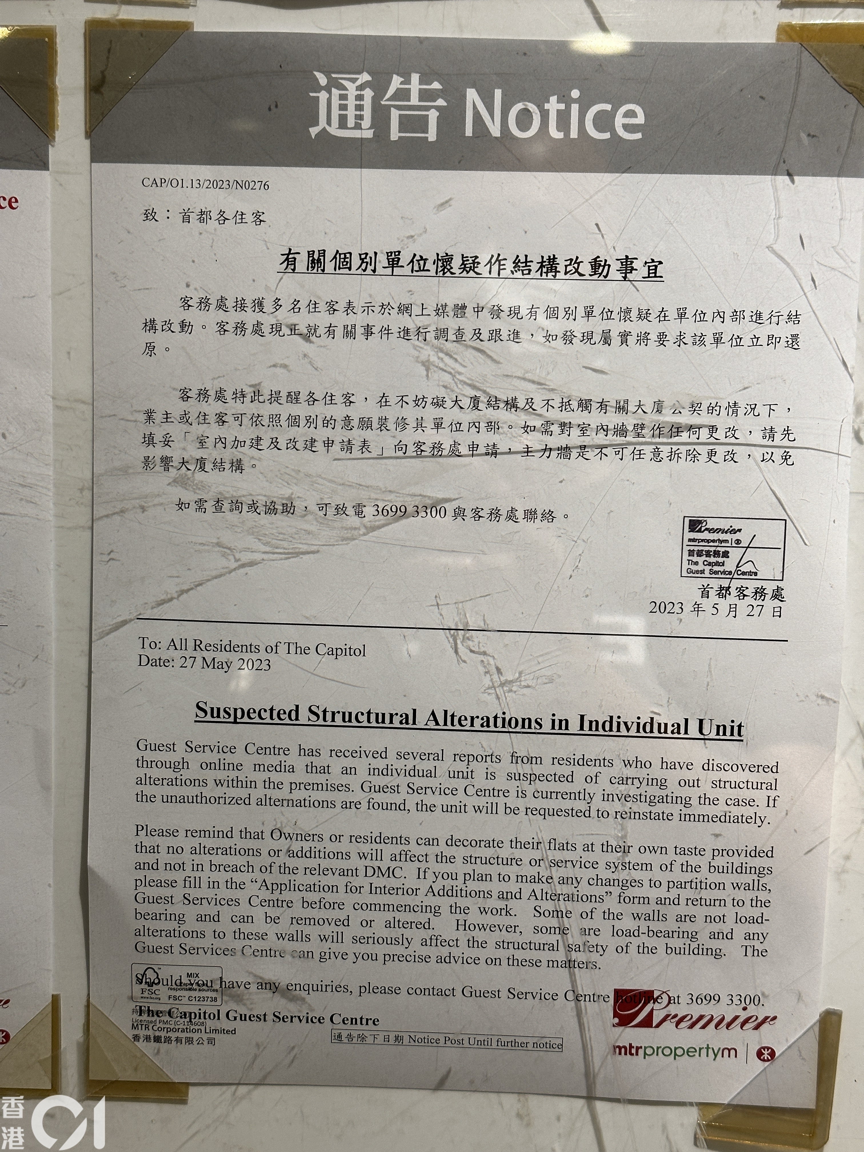 港鐵公司今日(28日)再回覆《香港01》查詢表示,經翻查紀錄,日出康城首都客務處未曾收到有關單位就改動單位結構的裝修申請。客務處已隨即聯絡有關單位的業主跟進,以便盡快安排專業工程人員進入其單位了解。港鐵公司又指出,所有單位在裝修前,必須向客務處申請進行裝修工程,如裝修包括改動單位結構部分,業主必須向相關政府部門申請及得到批核。如客務處發現單位有結構改動工程而未得到相關政府部門批准,客務處會向所屬單位業主提出要求進行還原工程,並須得到具專業資格人士審批完工。同時,客務處會向所屬單位業主保留追究因未經批核改動工程而引起損失之一切權利。