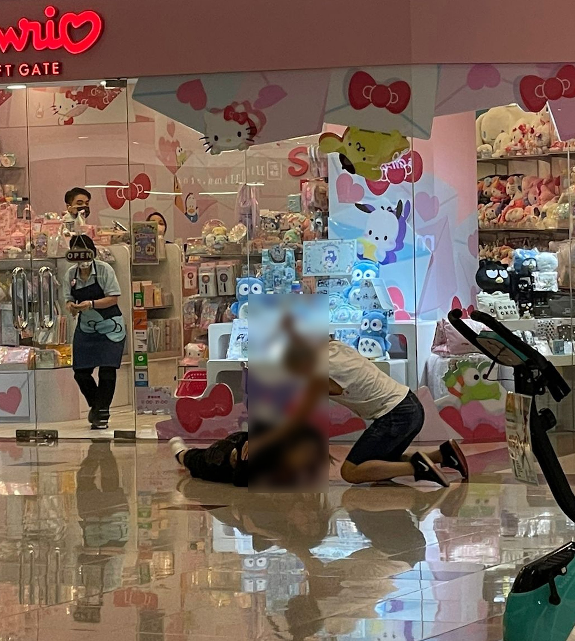 ) T1 B" P7 g9 M+ c約10分鐘後,警方接獲大量市民報警,指在3樓近戲院對開發生斬人案件,該處距家品店約200米。CCTV拍下行兇經過,當時走廊內遊人如鯽,兩名身穿黑衣的女事主其時步出店舖,一人蓄短髮,另一人為啡長髮,她們站在走廊張望片刻及稍作對話,沒料到光頭漢突然從後疑用魚生刀刺向短髮女的腰背至少4下,短髮女隨即跌坐在地上,並以雙手擋架,光頭漢再用刀向其胸口狂插多4下。7 h! Y7 ?, w8 x- ~4 D
