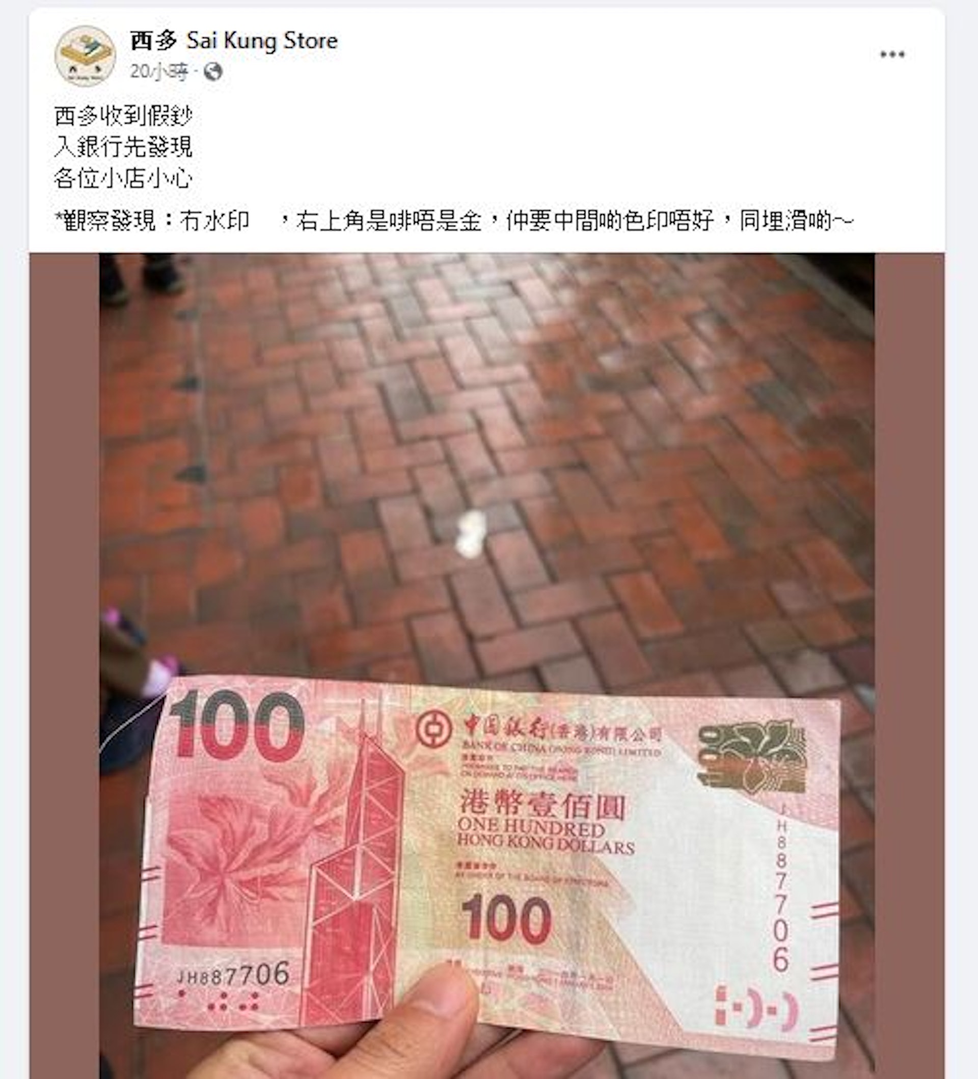 西貢雜貨店「西多」周三(2月7日)於Facebook發文上載照片表示,收到假100元港幣,「入銀行先發現……去咗兩間銀行機試幾次都入唔到,所以冇再試。之後有人講開拎出來望先發現係假假哋」5 X' ~ K Z; G: P& O