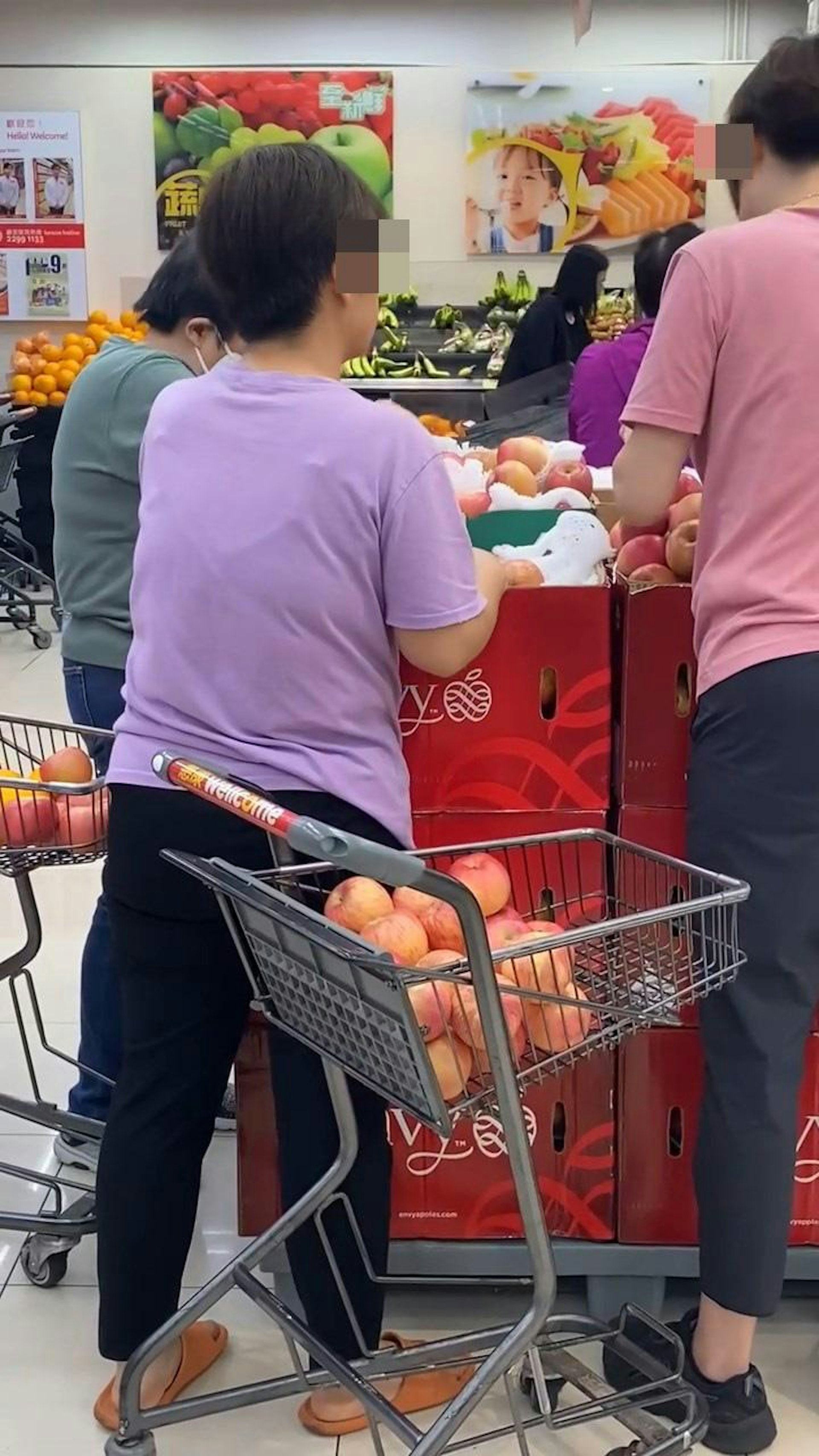 , g6 i6 E) D$ _公仔箱論壇3名大媽正站在蘋果攤位挑選蘋果,一拿起蘋果就拆開了包裝紙,而購物車上已堆放至少20個蘋果,全部都沒有包裝紙。(影片截圖)