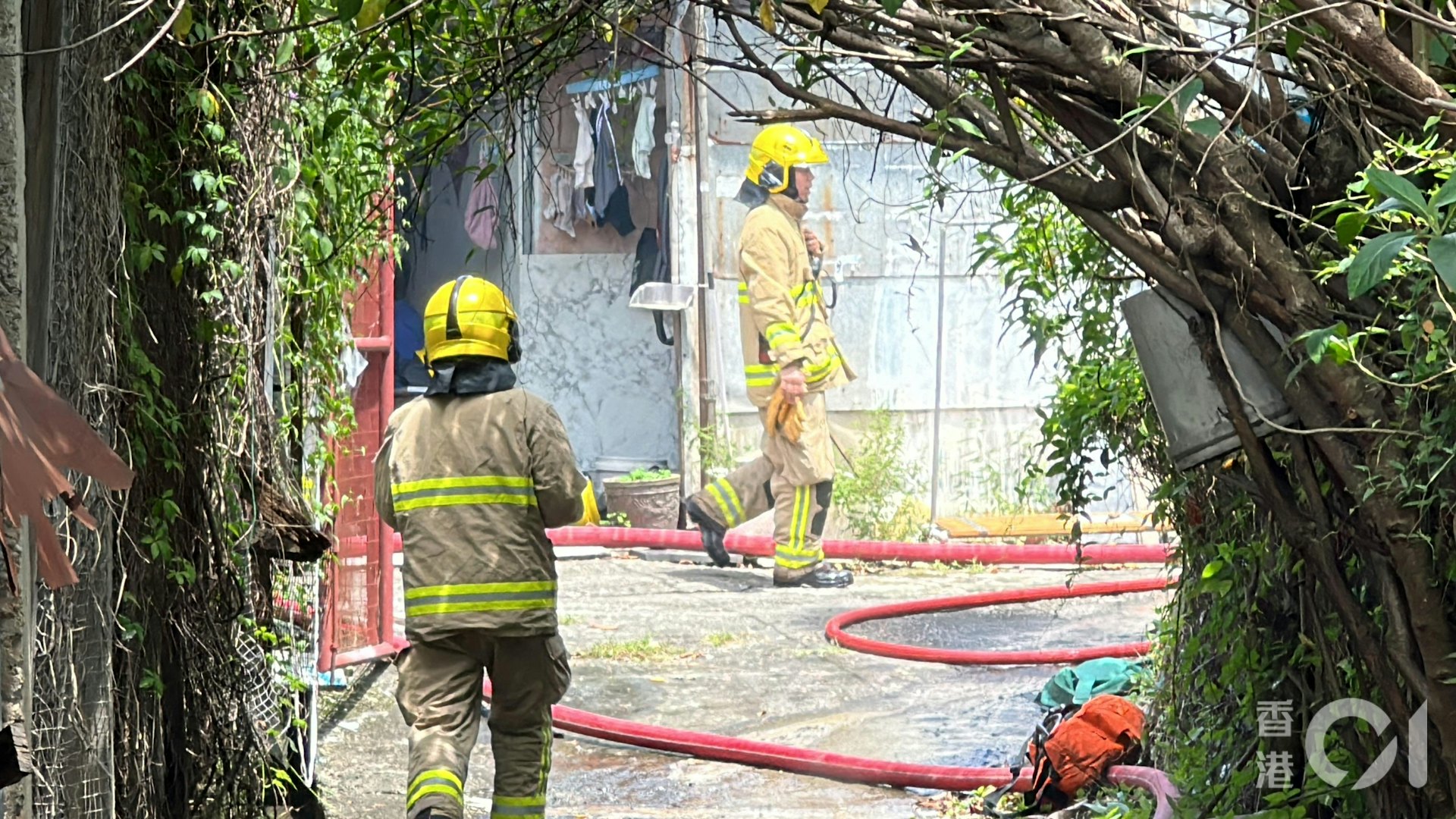 天水圍東頭村一間寮屋起火,一名男子死亡,警方封鎖現場,聯同消防調查起火原因。(林振華攝)