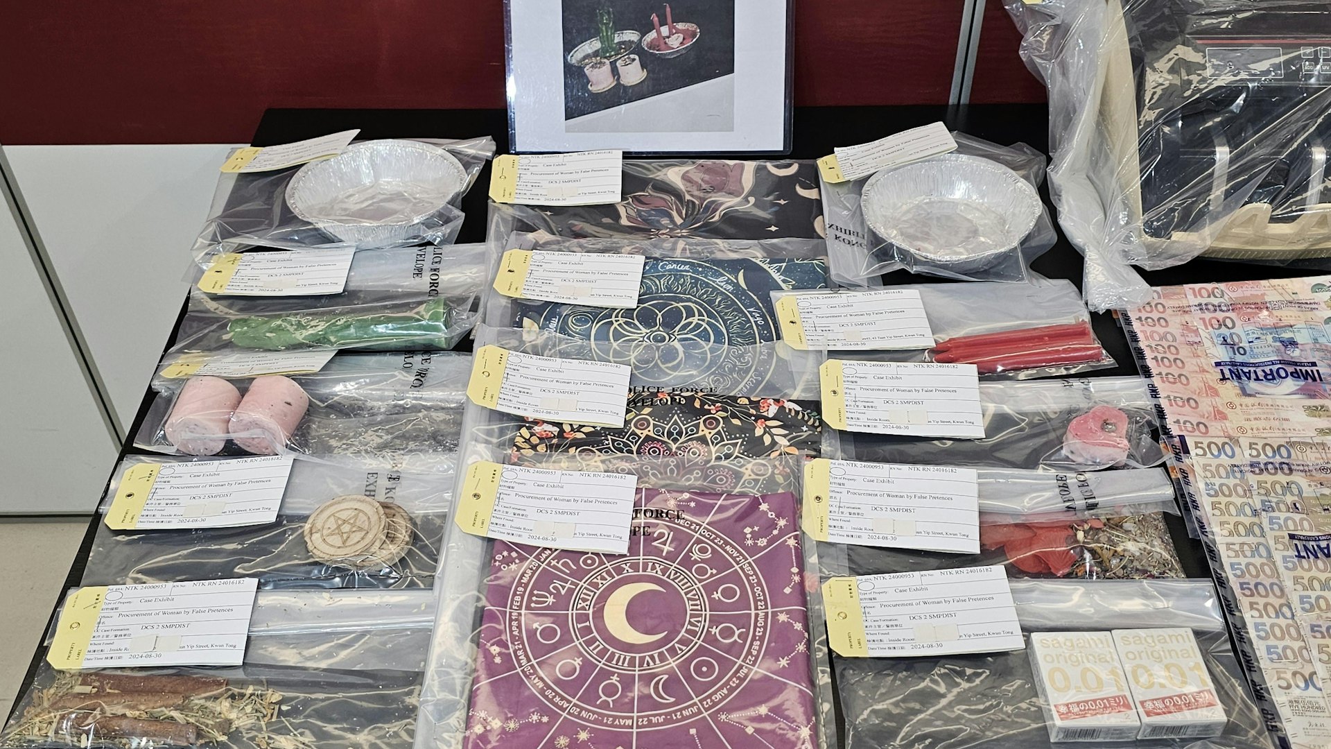 警方在單位搜出不同類型占卜用品、銀行卡。(梁偉權攝)