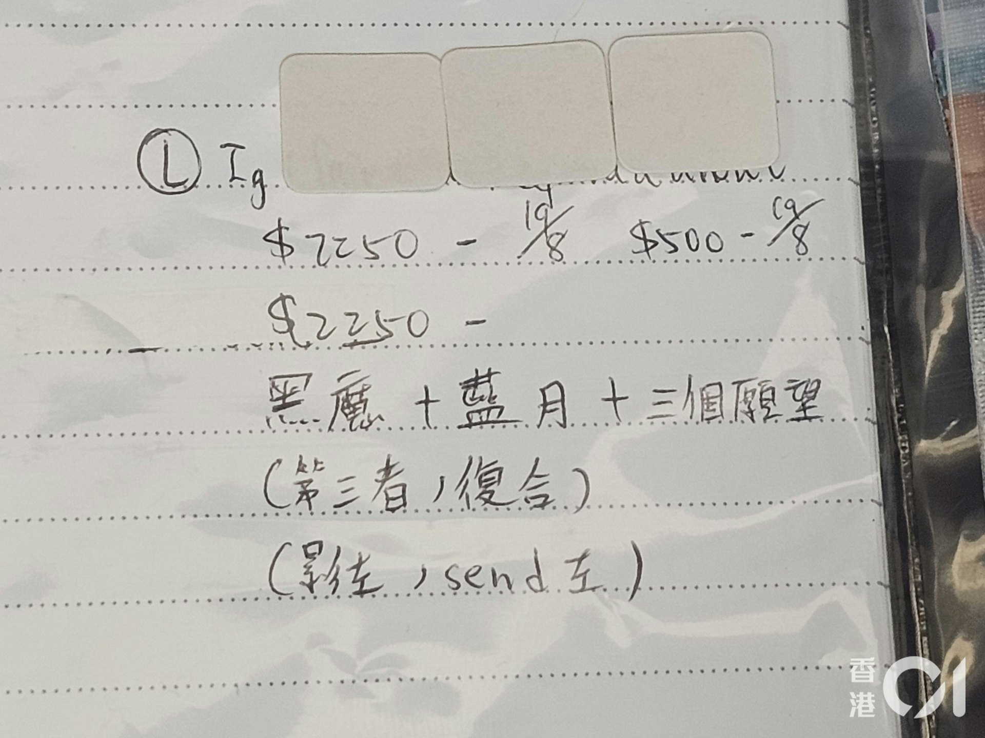 警方在單位檢獲記帳簿,其中有寫上一些儀式。(梁偉權攝)
