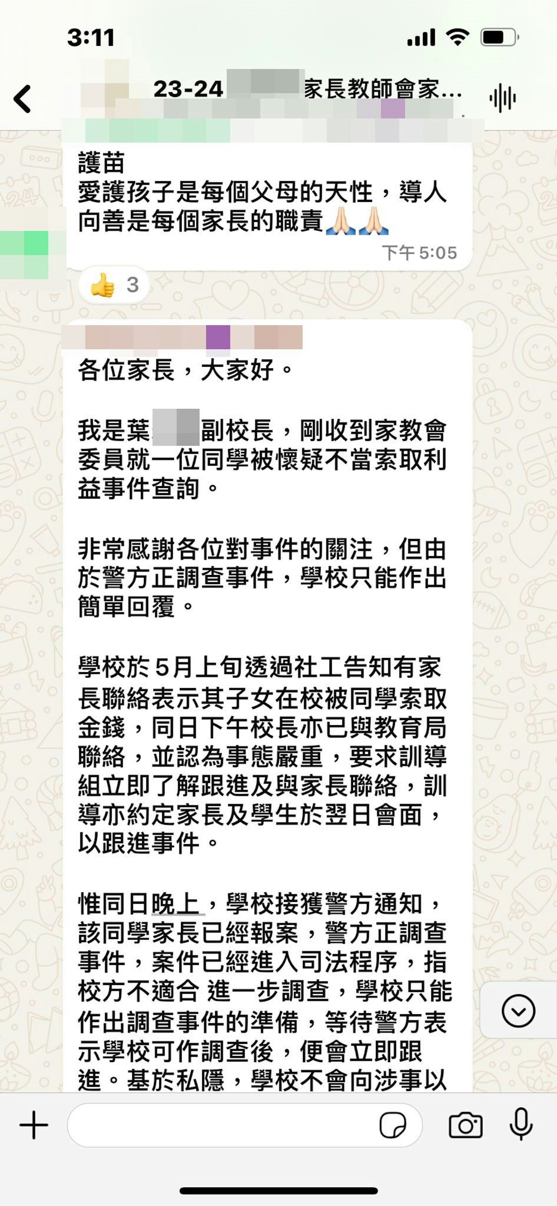 # v2 w2 z1 l! M2 M5 a. {www2.tvboxnow.com梁媽媽於家教會群組尋求協助。校方以案件已進入司法程序為由,著她要耐心等待。(受訪者提供)www2.tvboxnow.com0 t6 T6 ?2 k& d- S. R
