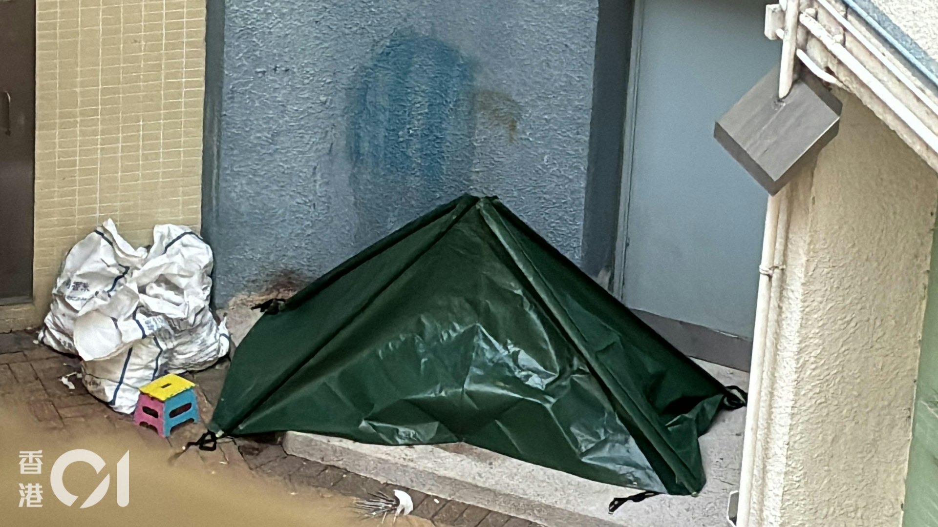 " `8 R" P7 ^+ k) V4 u東涌逸東邨漁逸樓一名男童墮樓,當場死亡,遺體以帳篷覆蓋。(林振華攝)