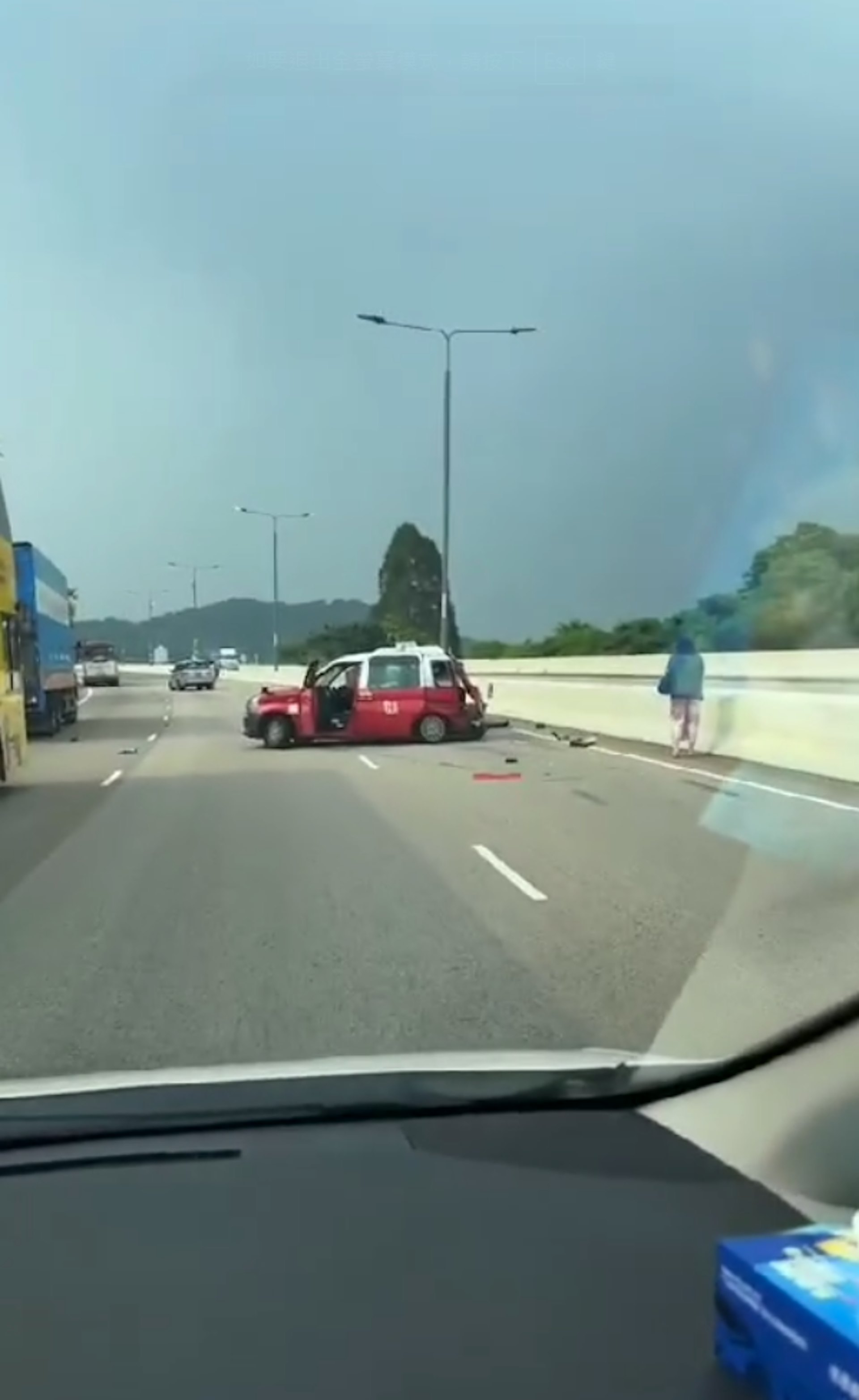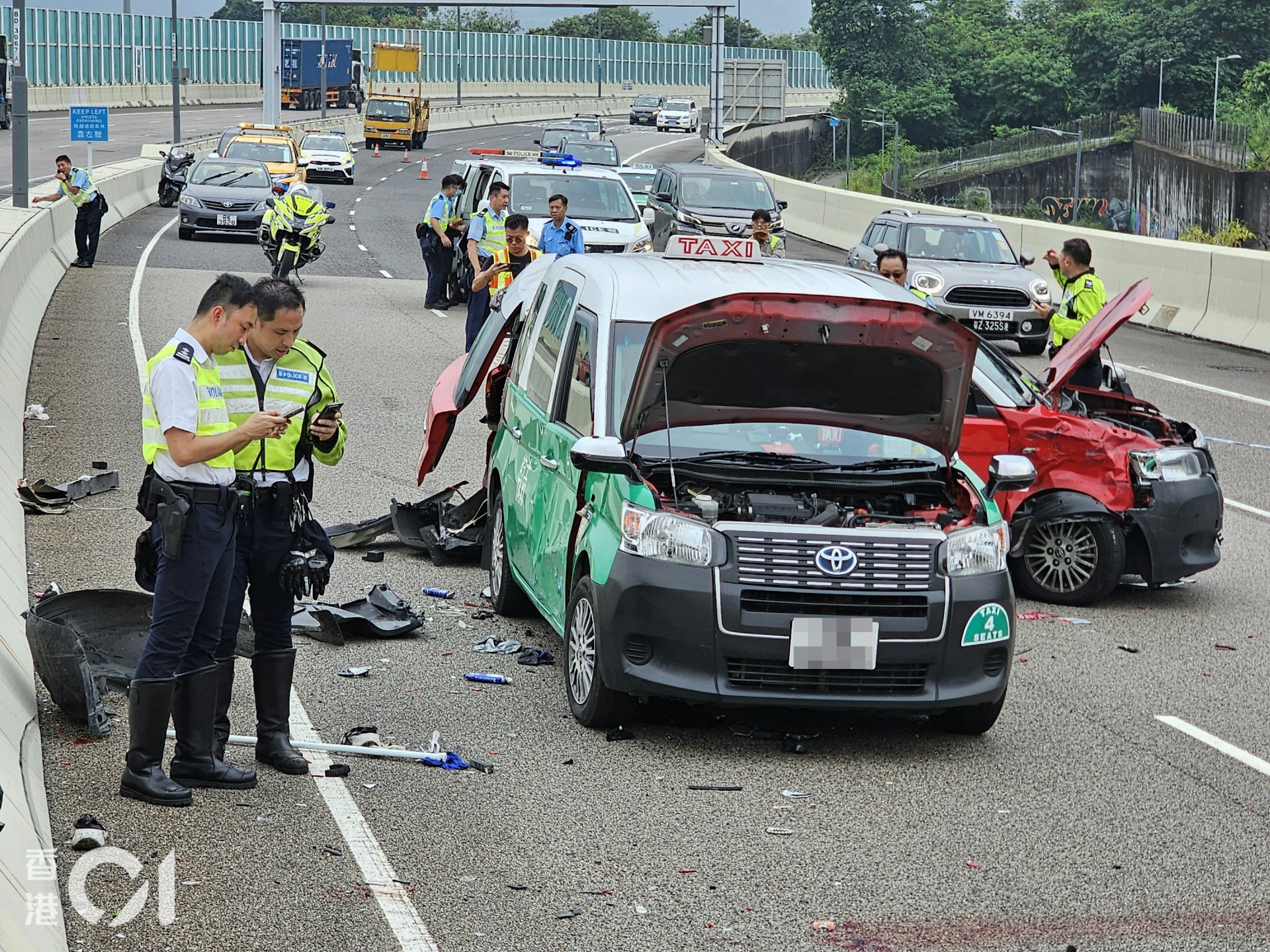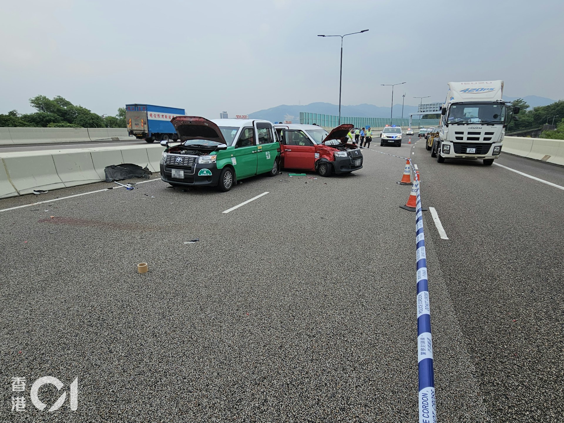 港深西部公路發生嚴重車禍,其中兩架的士停在快線。(梁偉權攝)
