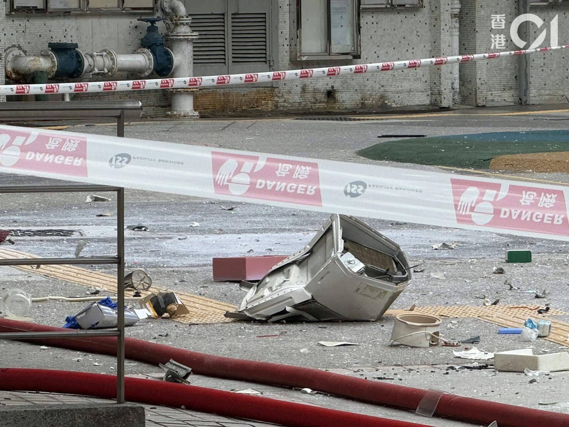 大量碎片飛散街上,包括冷氣機及窗框等。(羅日昇攝)tvb now,tvbnow,bttvb3 Z- X7 K0 d3 P- W& y9 {' P6 f) R