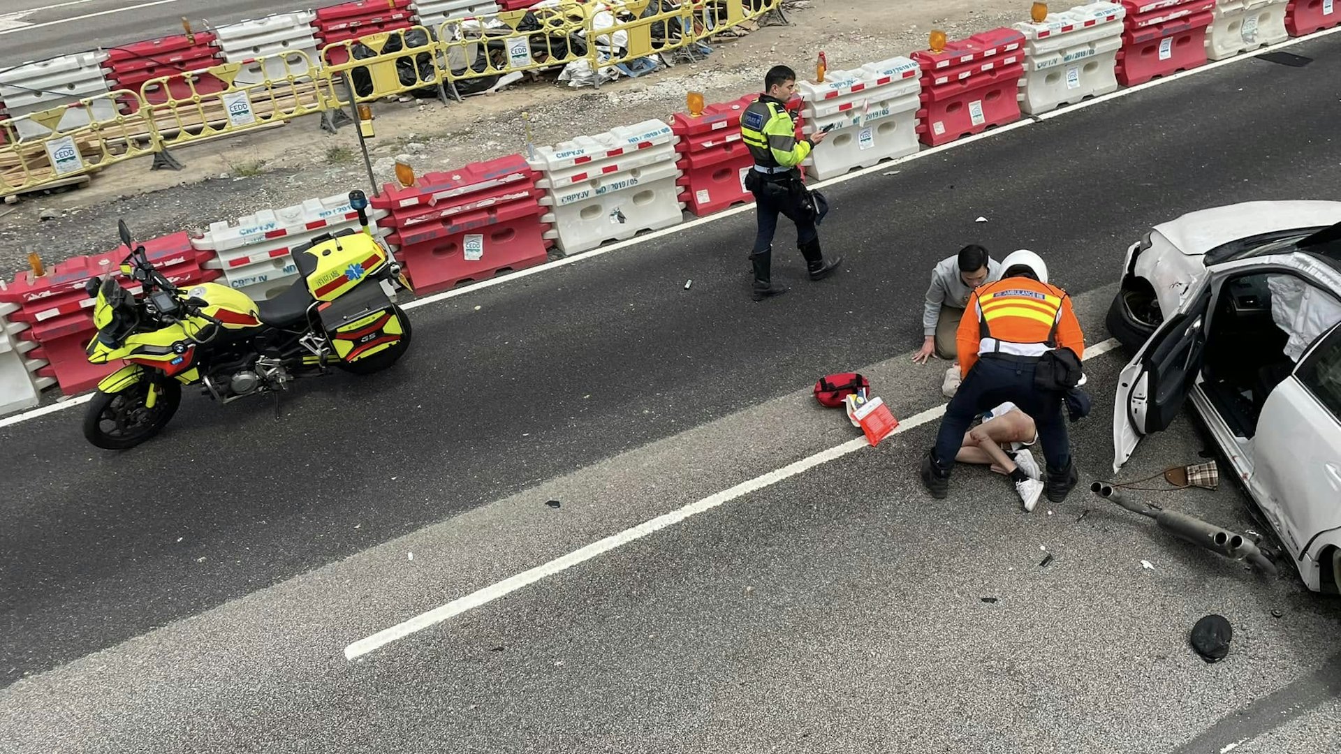 * J+ Y7 Q8 o' K. ~- E/ ~4 ~白色私家車上一名女子受傷,熱心人士上前協助。(青衣街坊吹水會/Hazukasi Suen圖片)