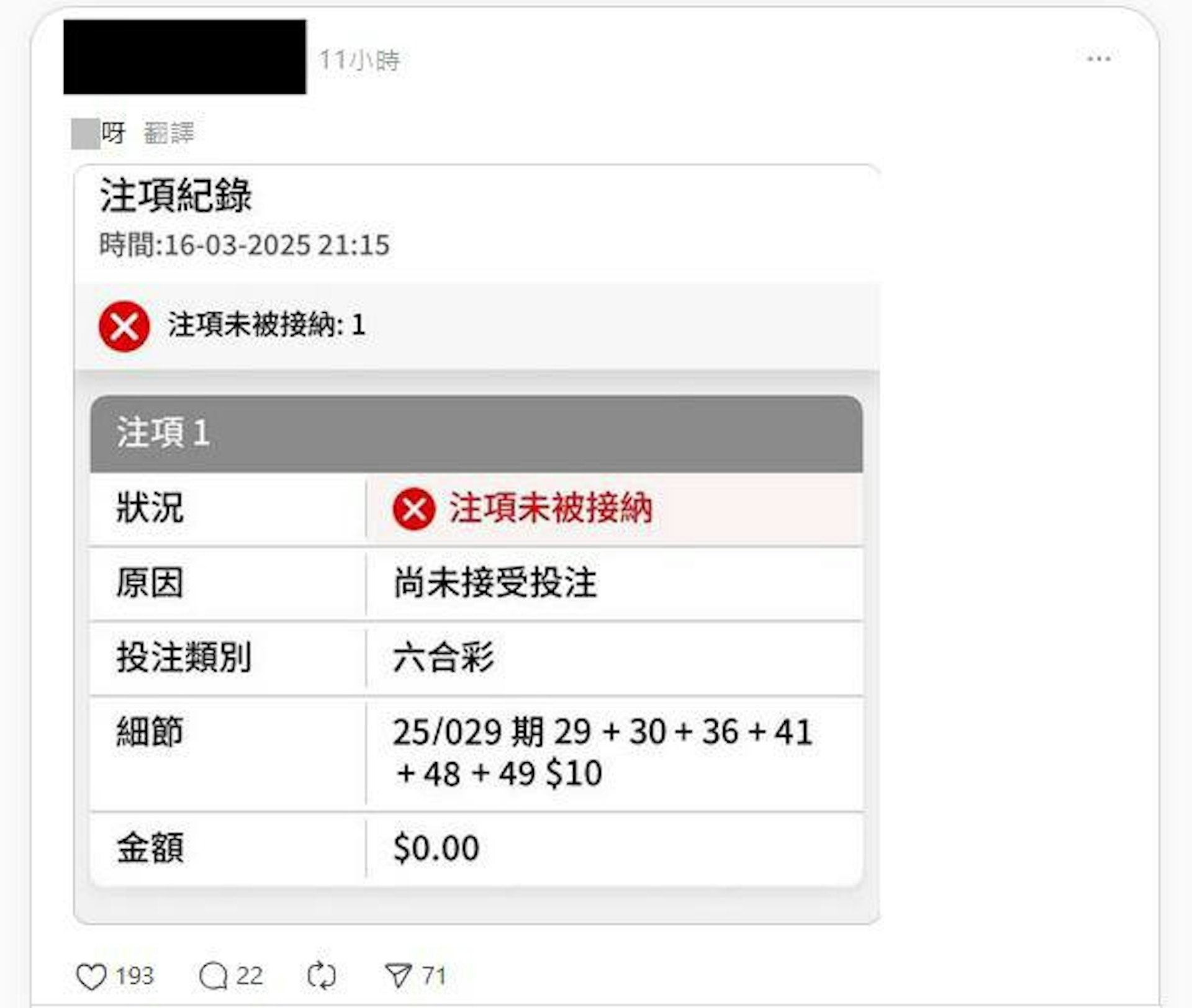 ! T. {- S' D Y, @! s& }截圖看到,他選了29號、30號、36號、41號、48號、49號這6個號碼,與頭獎攪出號碼相同,購買時間是2025年3月16日21時15分(晚上9時15分)。惟由於晚上9時15分已到六合彩截止投注時間,他選中的號碼未能成功落注,截圖亦顯示「注項未被接納」、「尚未接受投注」,與頭獎「擦身而過」。公仔箱論壇8 ?4 X, P) ~+ a0 `* C5 V4 Q0 q6 g