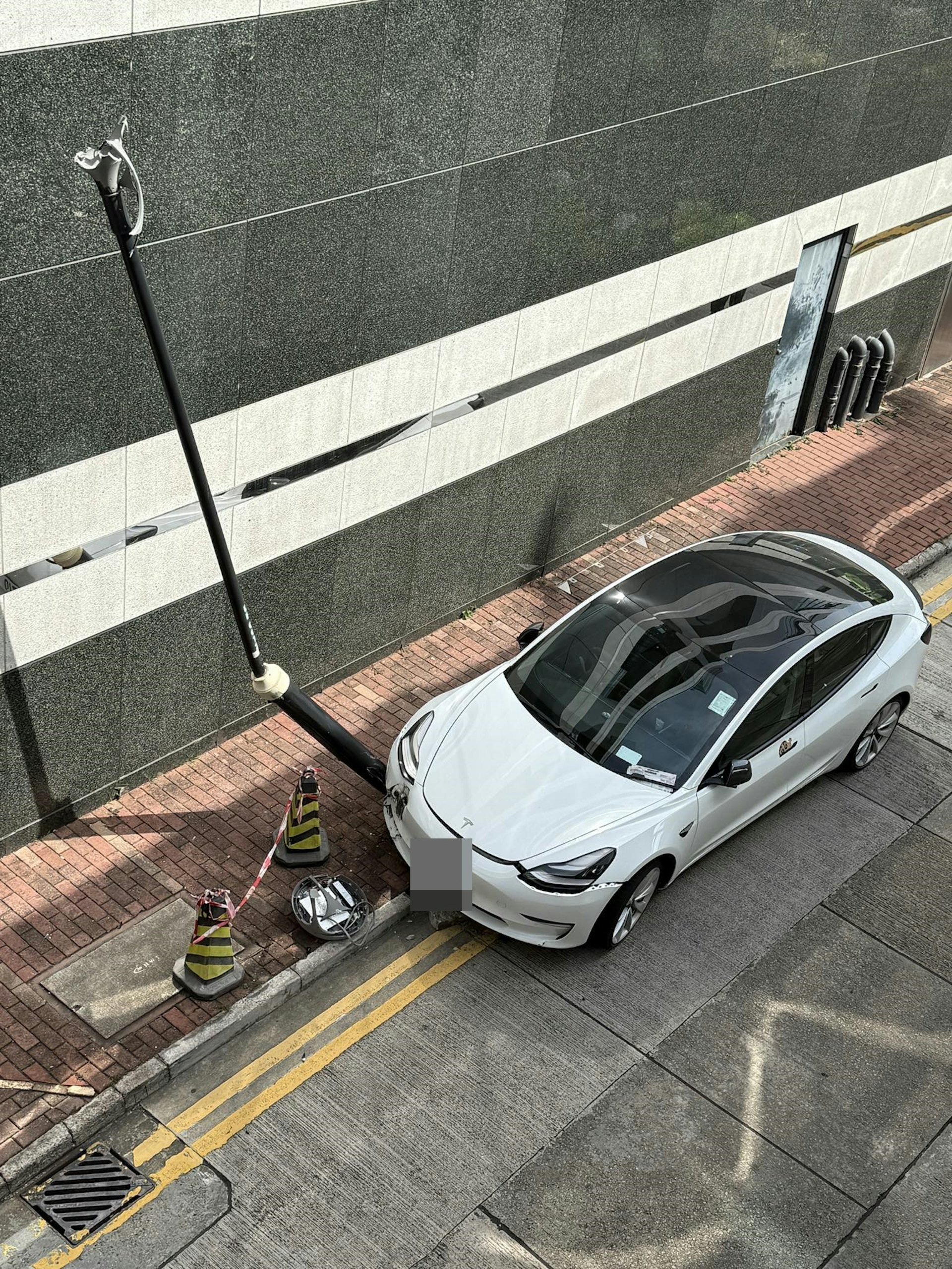 網上圖片可見,Tesla剷上行人路撞倒一支燈柱,燈柱被撞至彎曲傾斜,Tesla車頭則輕微損毀,車頭夾有一張定額罰款通知書。案件列作發生交通意外不顧而去處理。