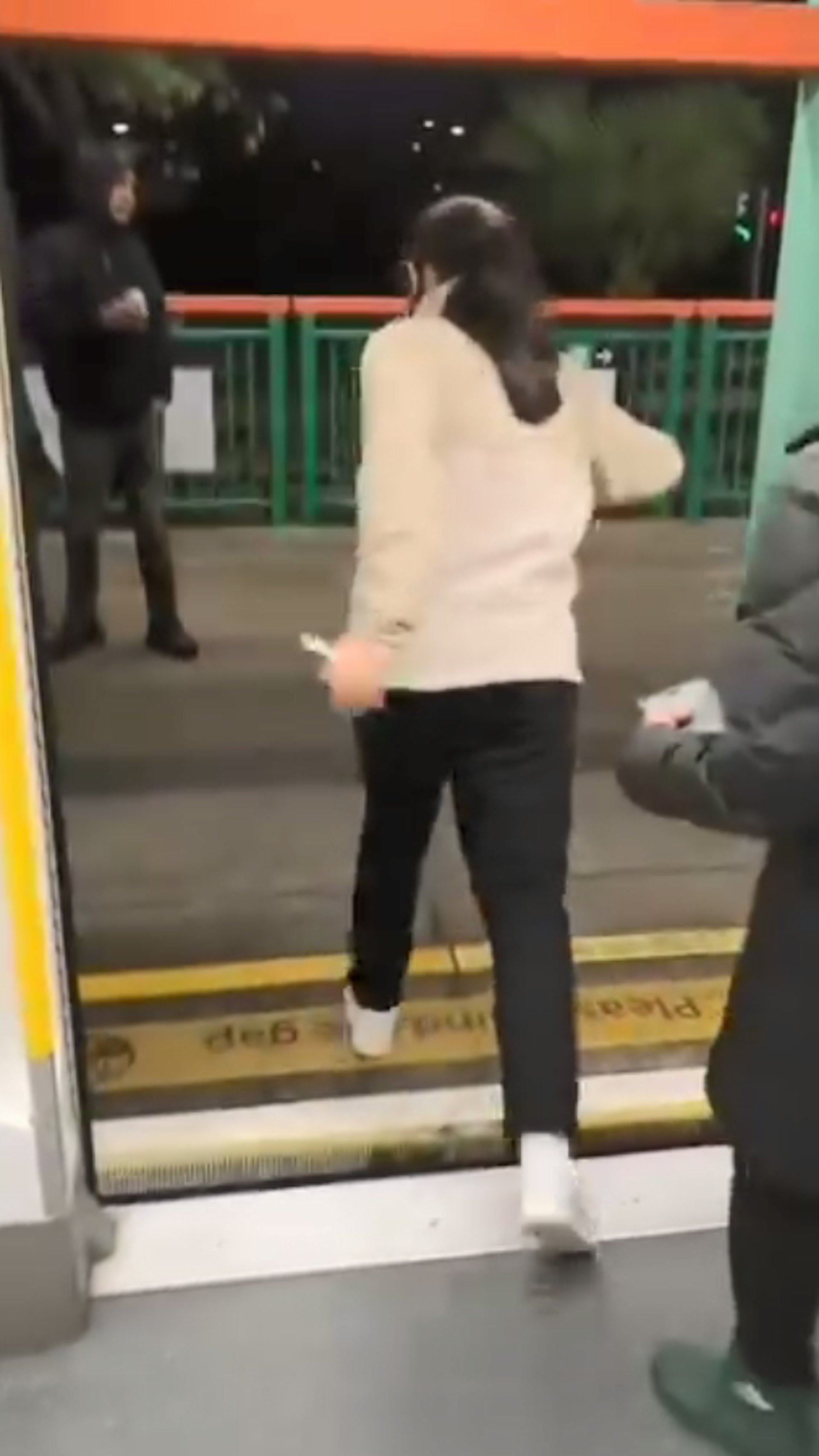 1 `2 K3 I; [% m4 E2 D8 _公仔箱論壇在影片尾段,可見她在扶著月台欄杆,猶如不能控制其雙腳般離去。(車CAM L/Bosco Chu影片截圖) |