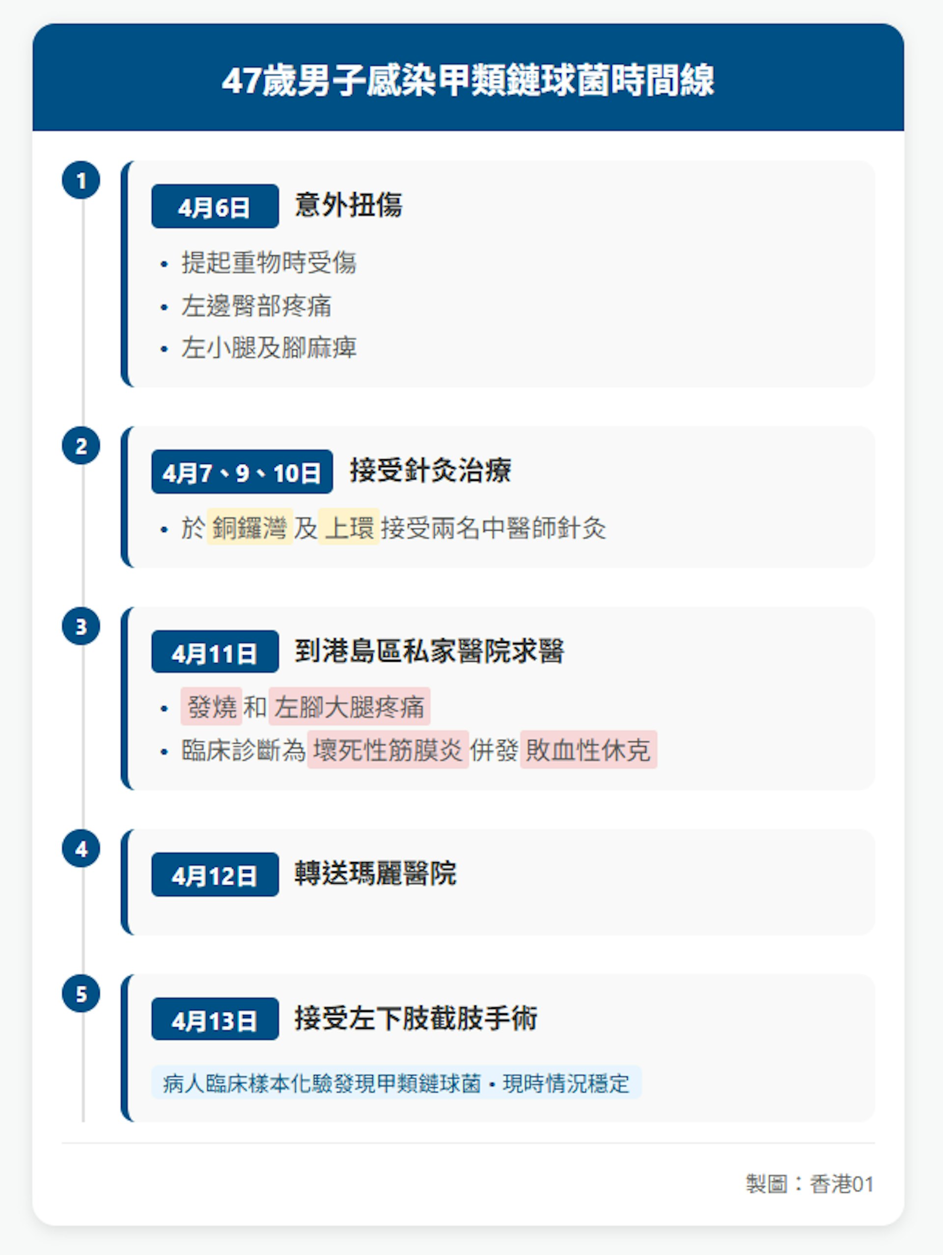 該名47歲男子4月6日提起重物時意外扭傷,繼而左邊臀部疼痛、左小腿及腳麻痺。他4月7、9、10日曾到上環及銅鑼灣,接受兩名註冊中醫師的針灸治療。病人壞死性筋膜炎併發敗血性休克 左下肢截肢, B& l- G8 _8 |
