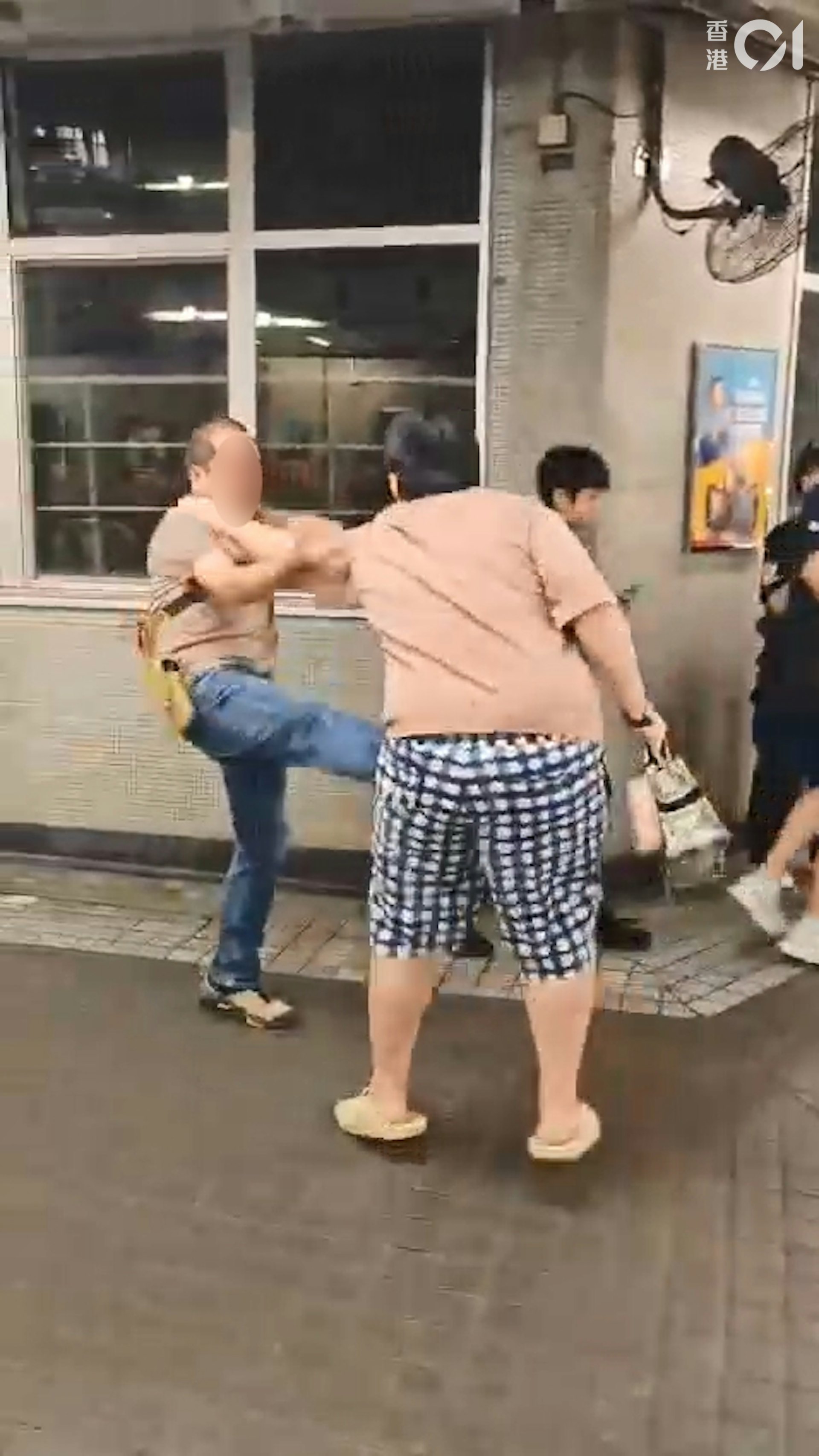有份勸阻青年的事主唐先生(左)被青年出手叉頸。(受訪者提供影片截圖)www2.tvboxnow.com; q0 r1 ~* h" V! a1 `* k4 o
