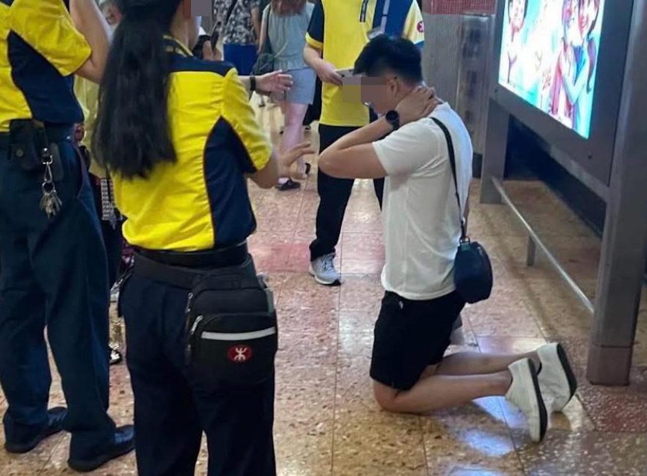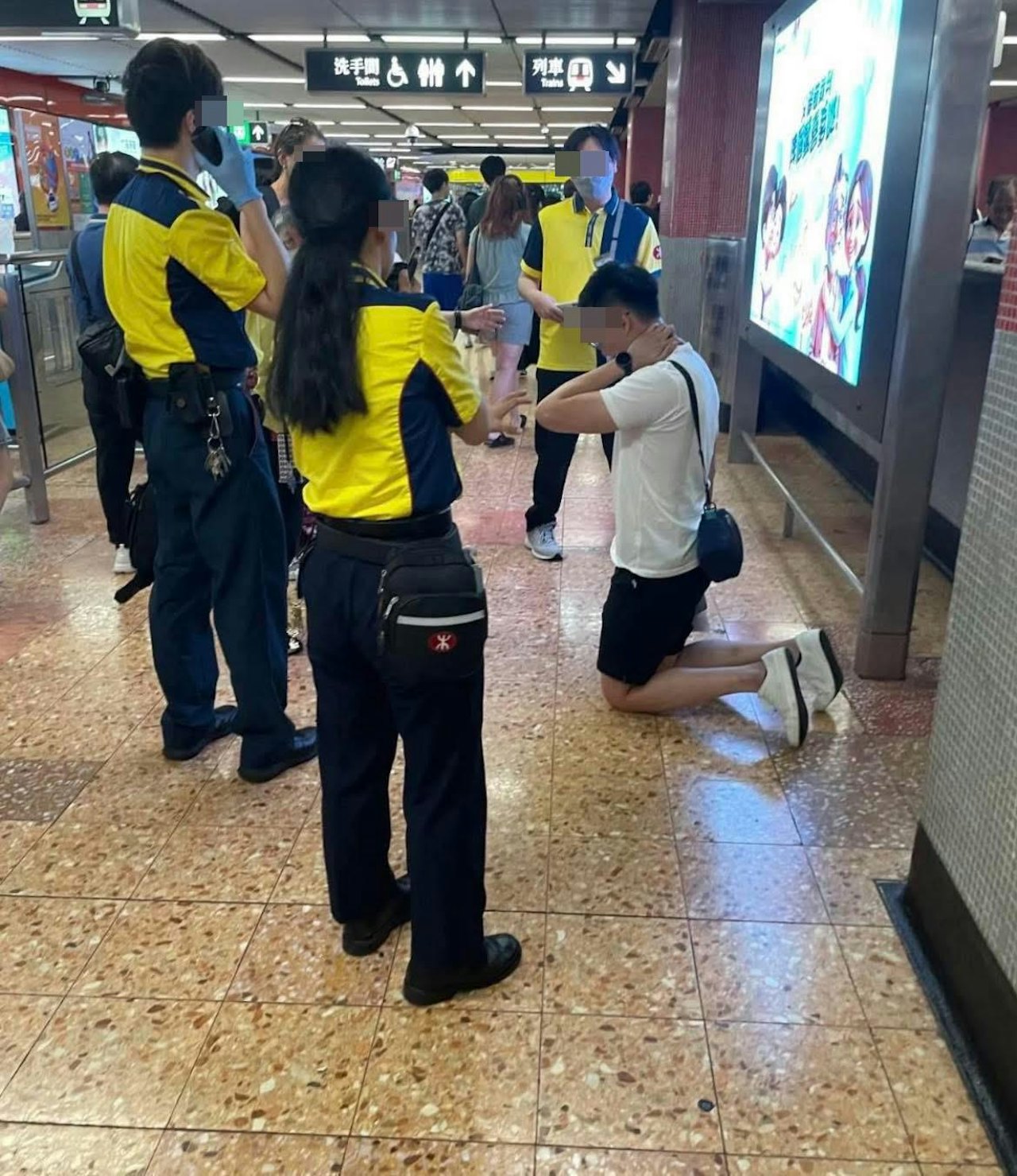" ]& g/ Q+ l2 w- e) t港鐵旺角站內有1名穿白色上衣男子低頭雙膝跪在地上,左手放在頸部近後頸位置,四周站了至少4名職員。(網上圖片)