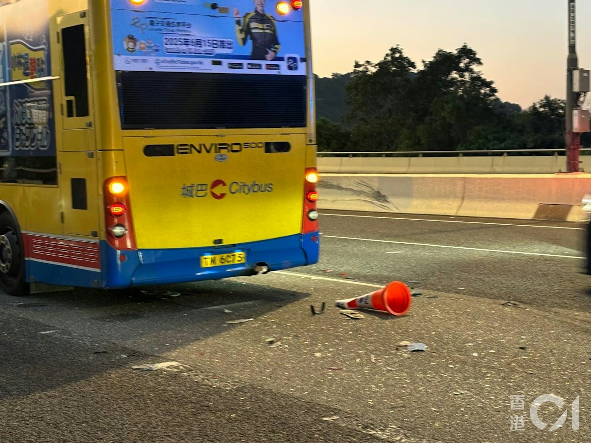 i9 m; t* o7 j, q9 v: ?3 J8 u$ G( B今早案發一刻的片段曝光,影片頻道「沿圖有理」向《香港01》提供拍攝了事發經過的車CAM影片,可見故障城巴當時停在左二線,警車停在後方約10米處,警車後放置了至少2個雪糕筒。其後,涉事B3X城巴沿同一行車線,從後方駛至,先掃跌雪糕筒,再直撞警車車尾。