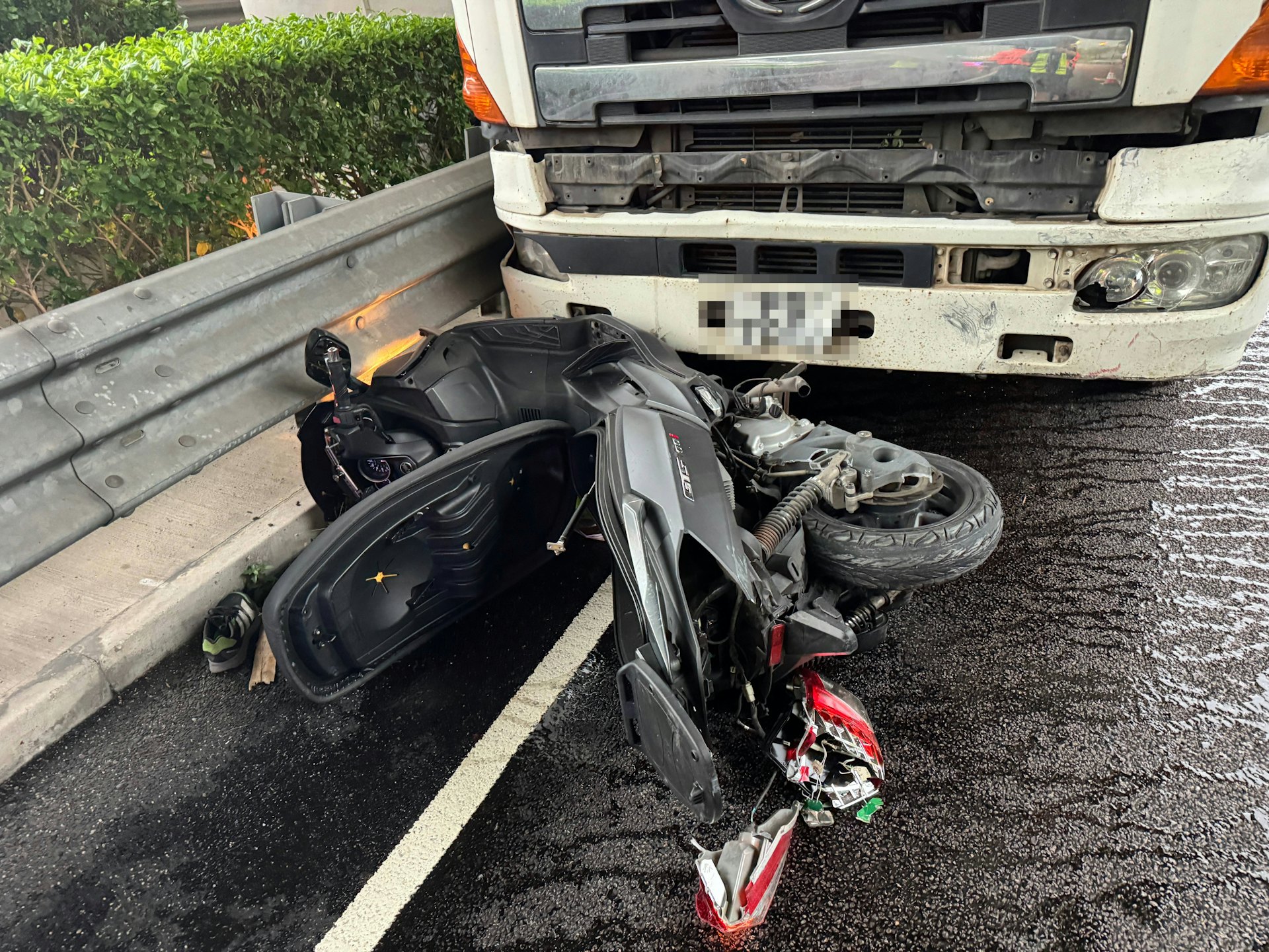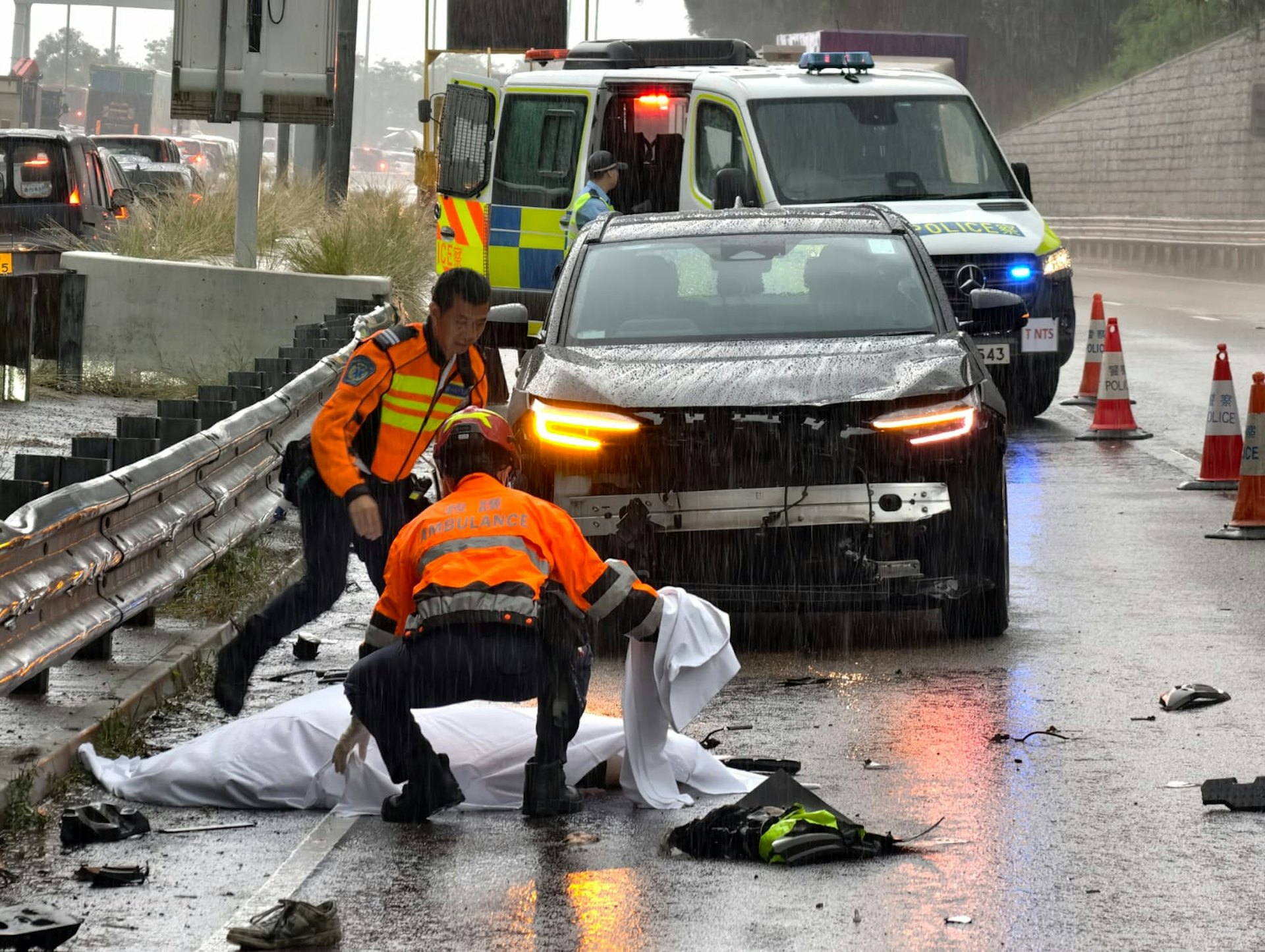 1 r( ], I$ D2 H y B- u' Q今日(13日)上午8時39分,青沙公路近南灣隧道出九龍管道發生奪命車禍。警方接報一輛中型貨車撞到電單車和私家車,鐵騎士重傷倒地,昏迷不醒。救援人員到場經檢驗,證實鐵騎士已告身亡;66歲拖頭司機涉嫌危險駕駛導致他人死亡被捕。