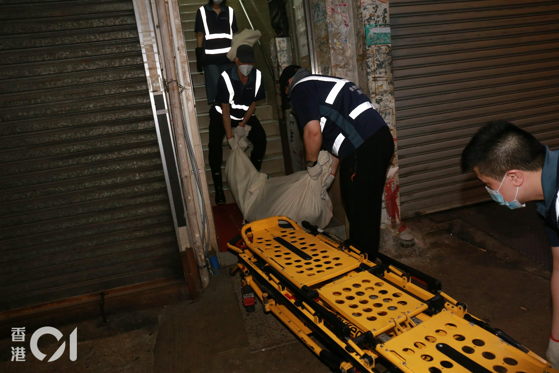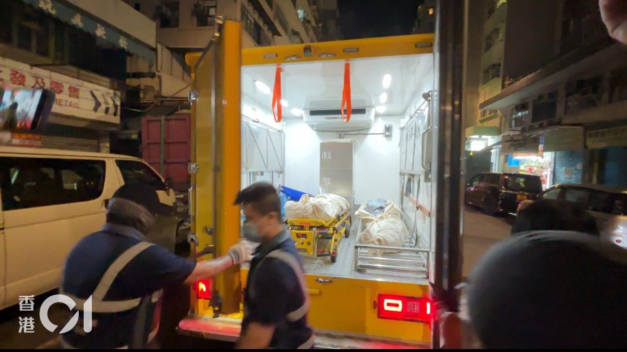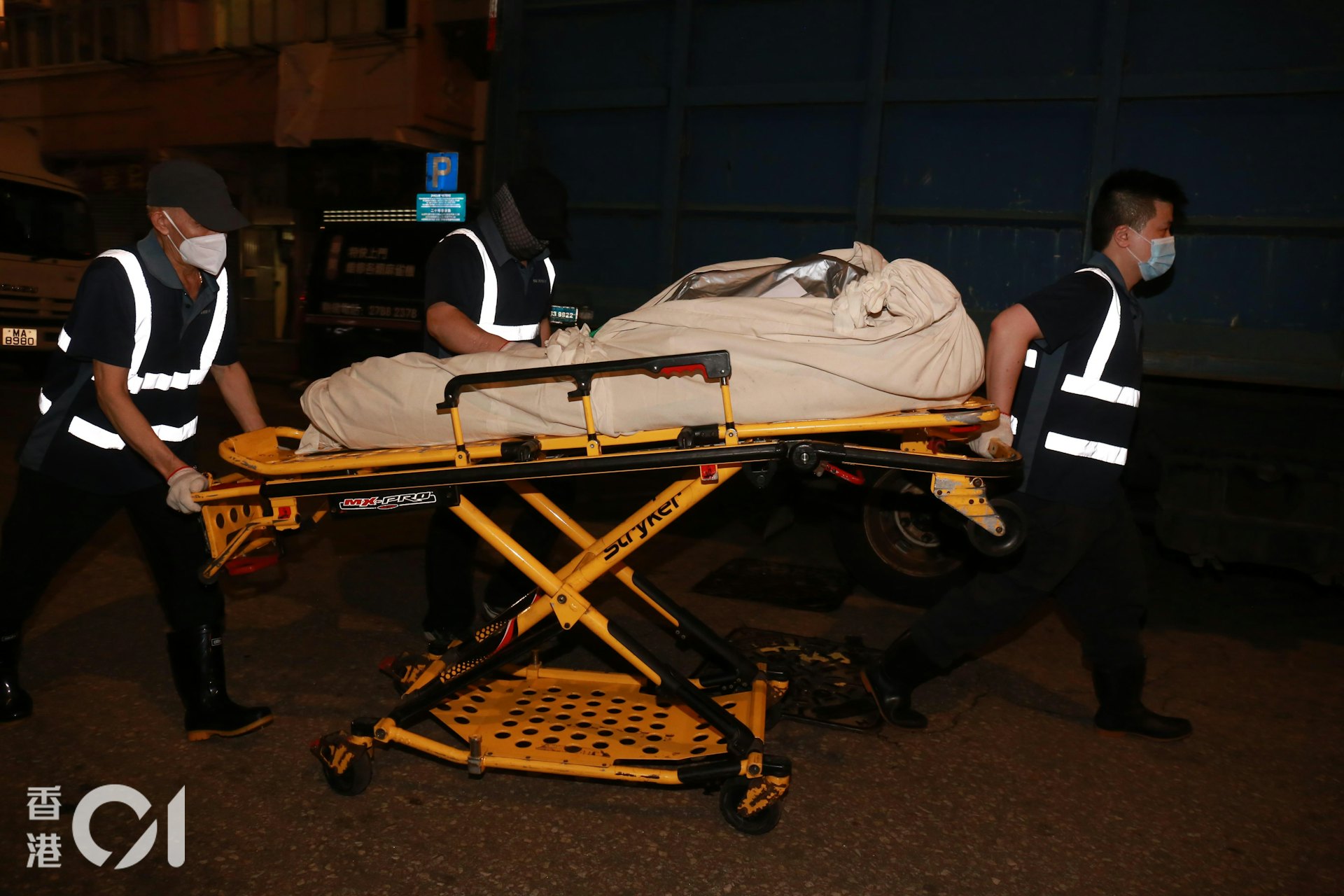 深水埗福榮街福星樓一對姐弟倒斃劏房內,仵工晚上到場,將男死者(左)和女死者(右)遺體送往殮房。(林振華攝)