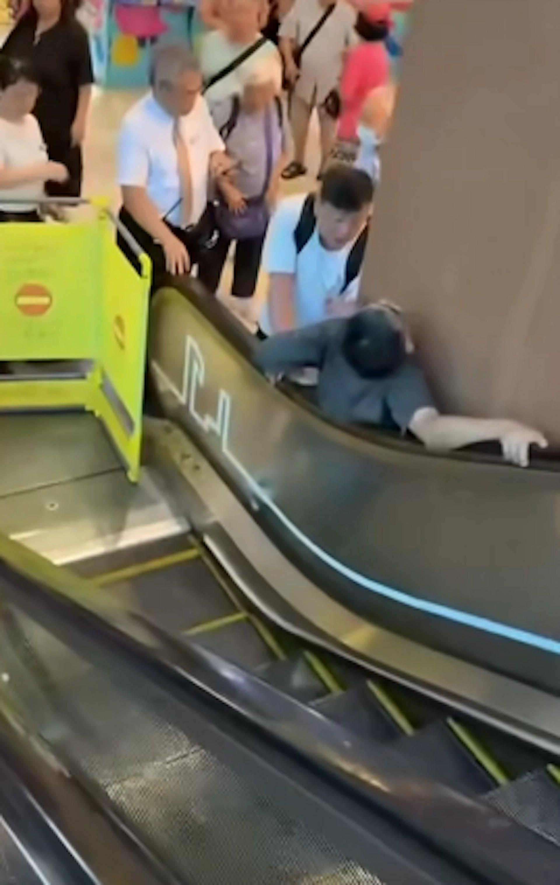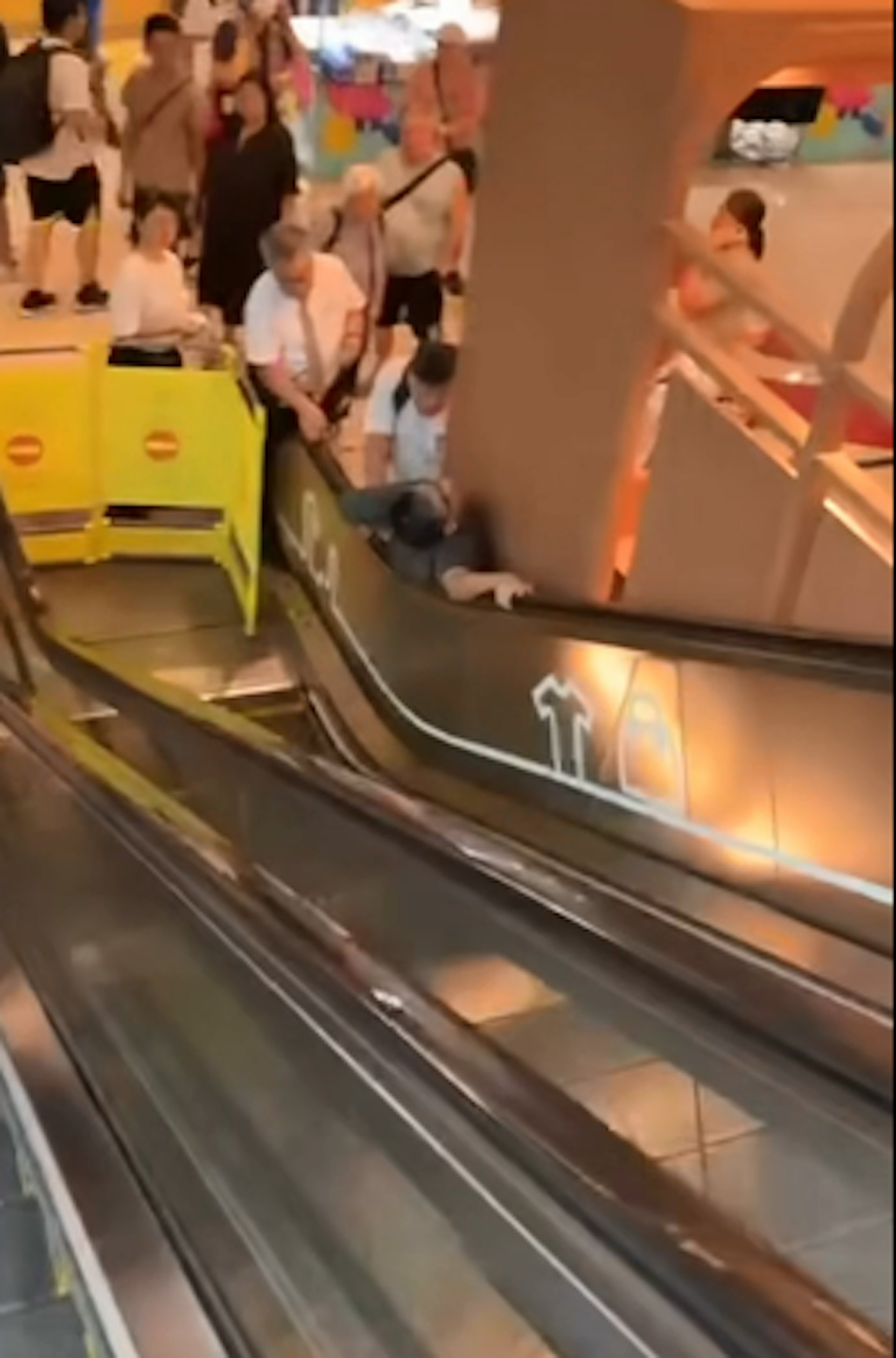 一名老人跌倒,在屯門安定邨H.A.N.D.S商場被扶手電梯夾住。(真.屯門友/Spirits Battle)