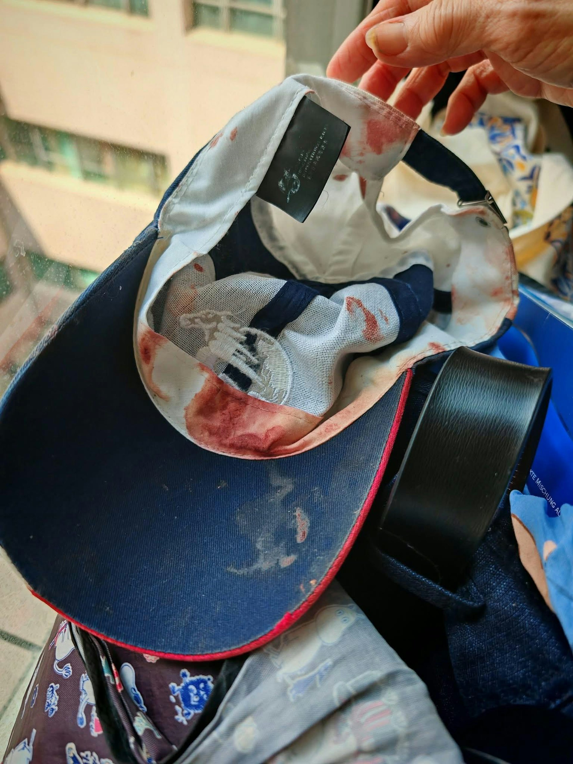 事主女兒發文貼上其父親被拳毆後染血的衣物。(fb/聯和墟的生活點滴 joan leung) |