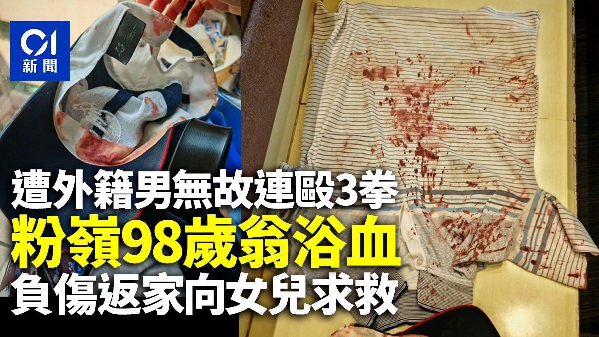 - }. [9 P" t/ ^; Y+ @事主女兒事後在facebook發文指,約清晨5時半左右,在軍地巴士站往上水方向,一名男子突然走到其父親面前,並「好近」看着他,該男子突然揮拳打人。她續稱,其父頭、鼻樑及手腳均受傷流血,又呼籲市民大眾要小心陌生外籍人。帖文圖片可見,老翁所穿戴的帽及衣服均染上鮮血。