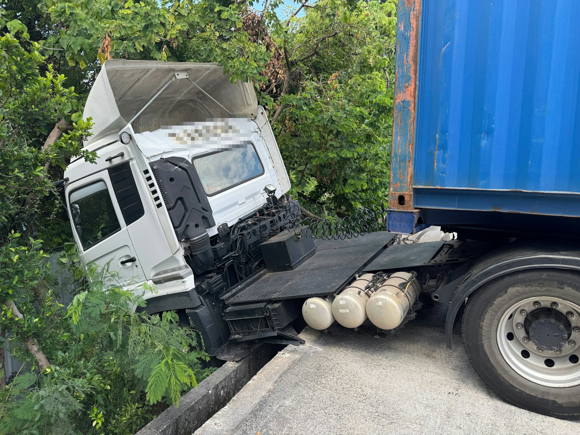 5 G, k) u0 Z' x' H8 A8 ztvb now,tvbnow,bttvb貨櫃車車頭跌在石壆外。(蔡正邦攝)
