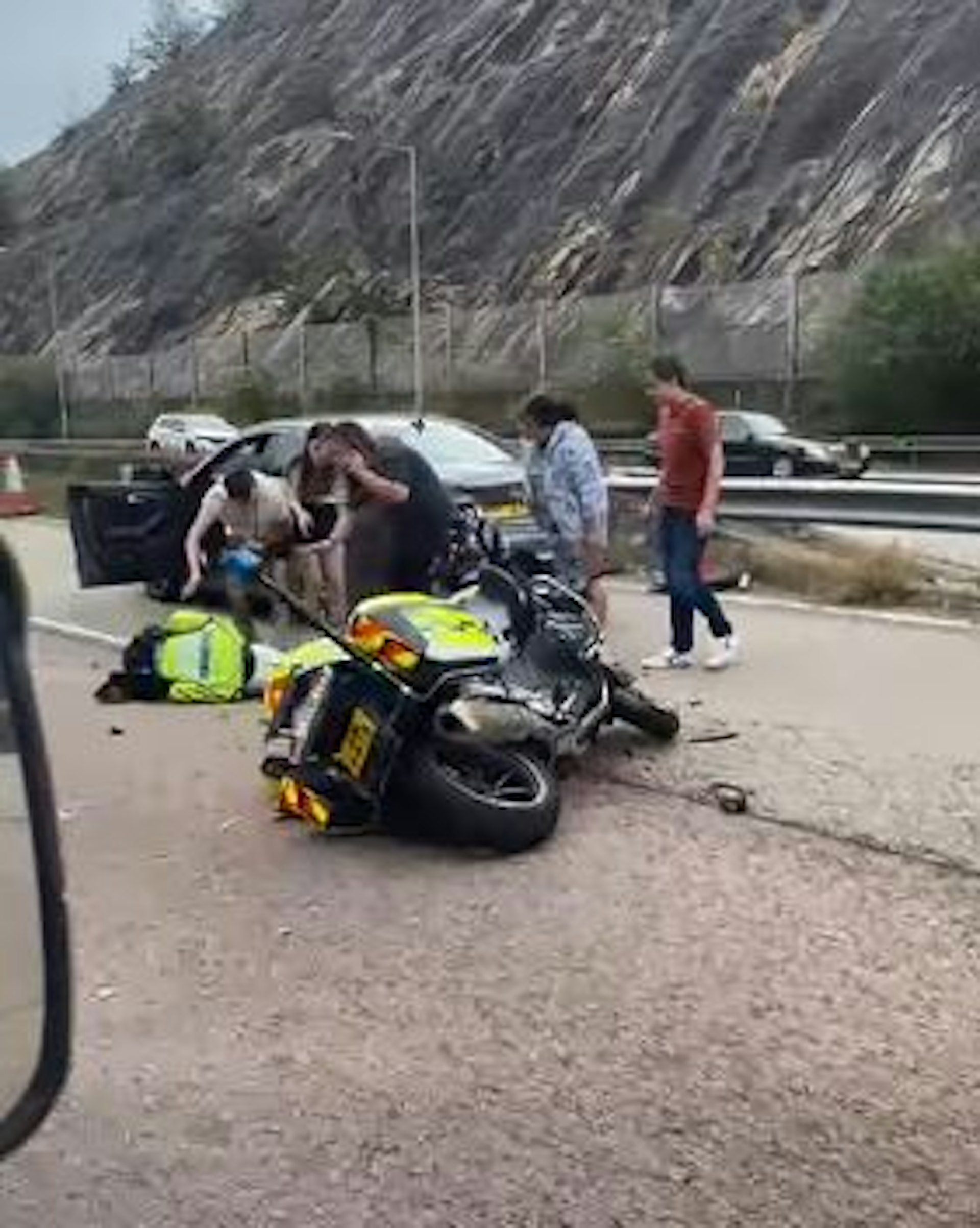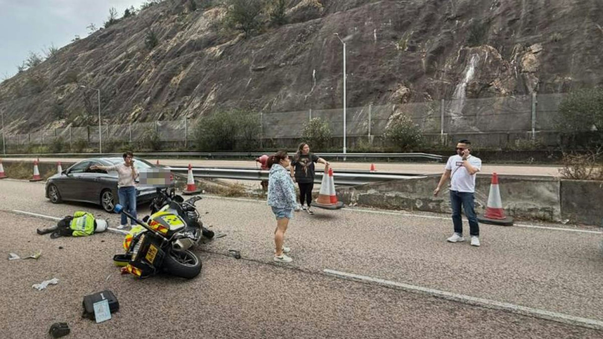 今日(1日)上午10時26分,一輛警方交通部電單車在青朗公路出九龍方向發生交通意外。據知,當時一輛平治私家車因油門問題壞車,所以停在快線上,尾隨一輛警察電單車疑收掣不及,直接撞到私家車左邊車尾。警員倒地受傷,電單車翻倒路中,有配件甩脫四散;平治左邊車尾凹陷。平治私家車男司機隨即報案求助。