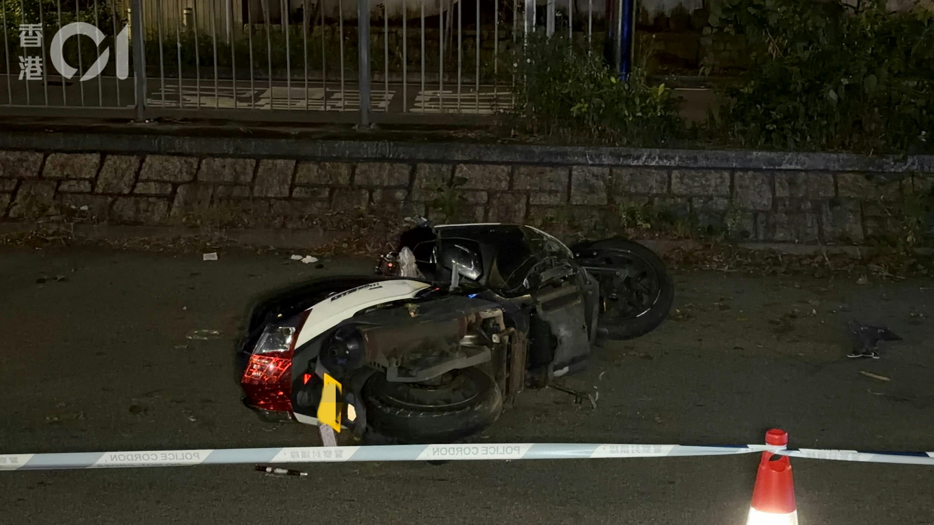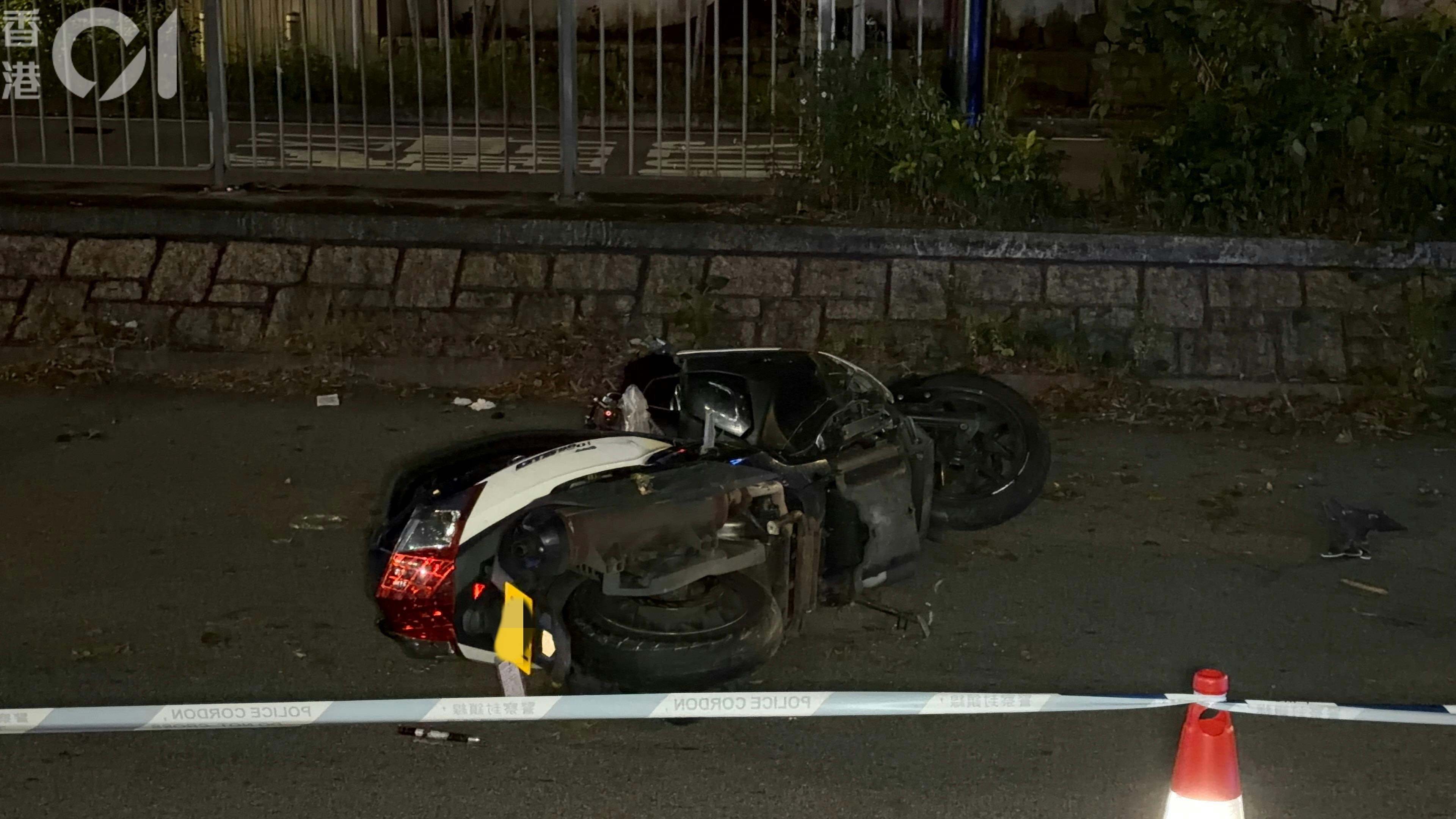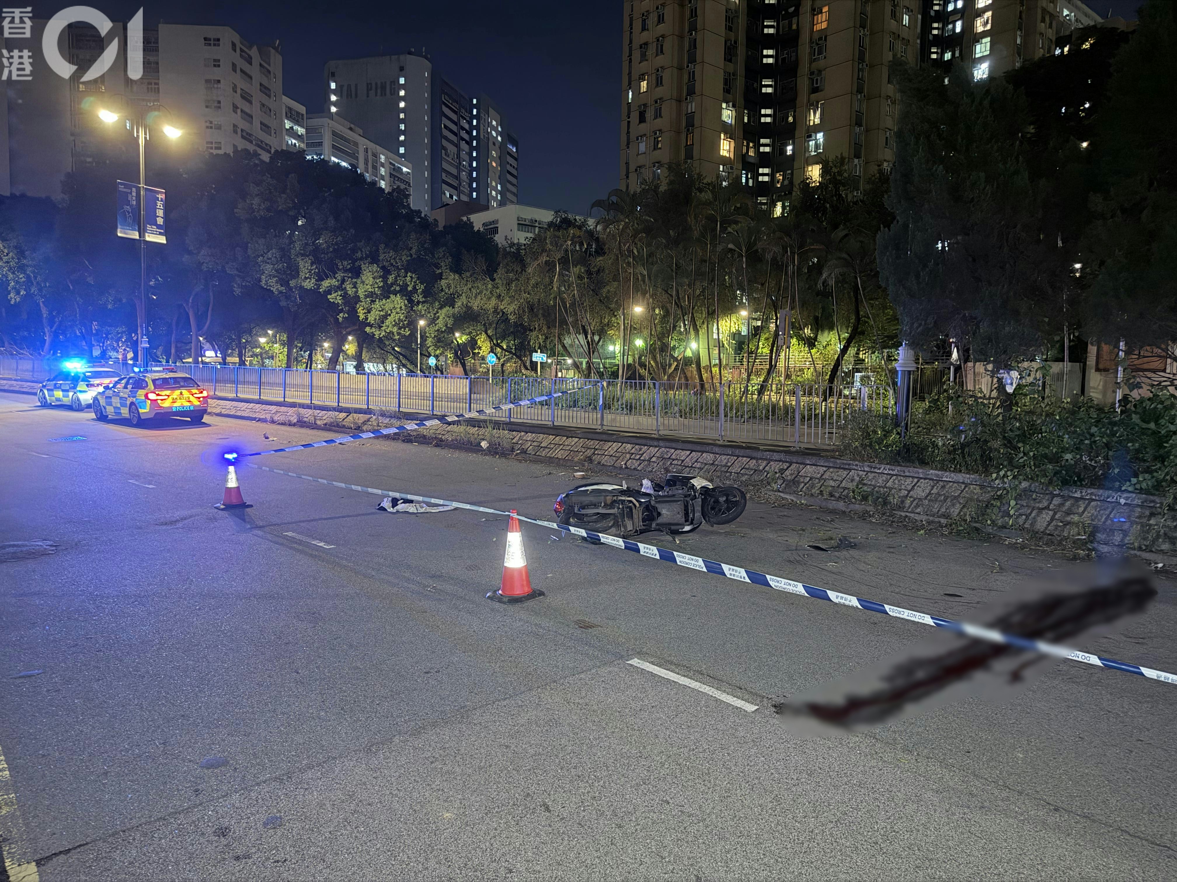 / i$ |! j+ M2 P, v* l. W ~意外後,電單車翻側擱於馬路,警員圍封現場調查。(羅日昇攝)www2.tvboxnow.com8 X& Y# ^+ L% B5 R/ a
