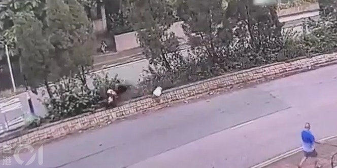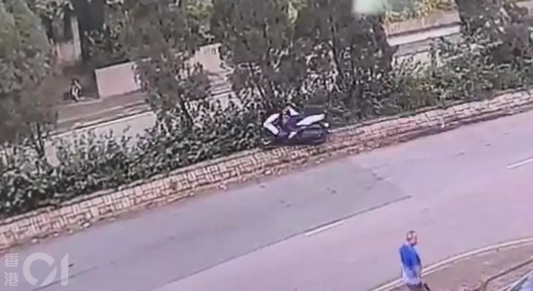 # [9 K1 K' N. U( k) ^0 P* }涉事電單車高速行駛,期懷疑失控挨向右邊石壆,再剷上壆。鐵騎士頭部猛撼一棵樹後,隨即「人車分離」翻滾倒地。(讀者提供影片截圖) t* `3 S4 F! ` w