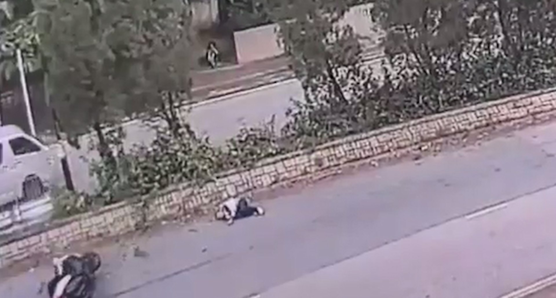 & v) i1 I' |! f意外後,人車雙雙跌於路面。(讀者提供影片截圖)