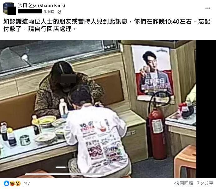 餐廳呼籲2人自行回餐廳付款,「如認識這兩位人士的朋友或當時人見到此訊息,你們在昨晚10:40左右,忘記付款了,請自行回店處理」。