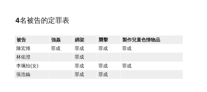 4名被告:陳宏烽(20歲,案發時為中二生)、林佑澄(19歲,跟車工人)、李珮怡(18歲,女),及張浩錀(20歲,職業訓練學院學生)。4人同被控綁架、襲擊、製作兒童色情物品3罪,陳單獨被控1項強姦罪,案發於2021年12月25日至26日,尖沙咀山林道某大廈單位。首被告陳宏烽綁架及強姦等罪成,被判囚8年。1 |; ^8 }* `* t! v; V1 p' Z