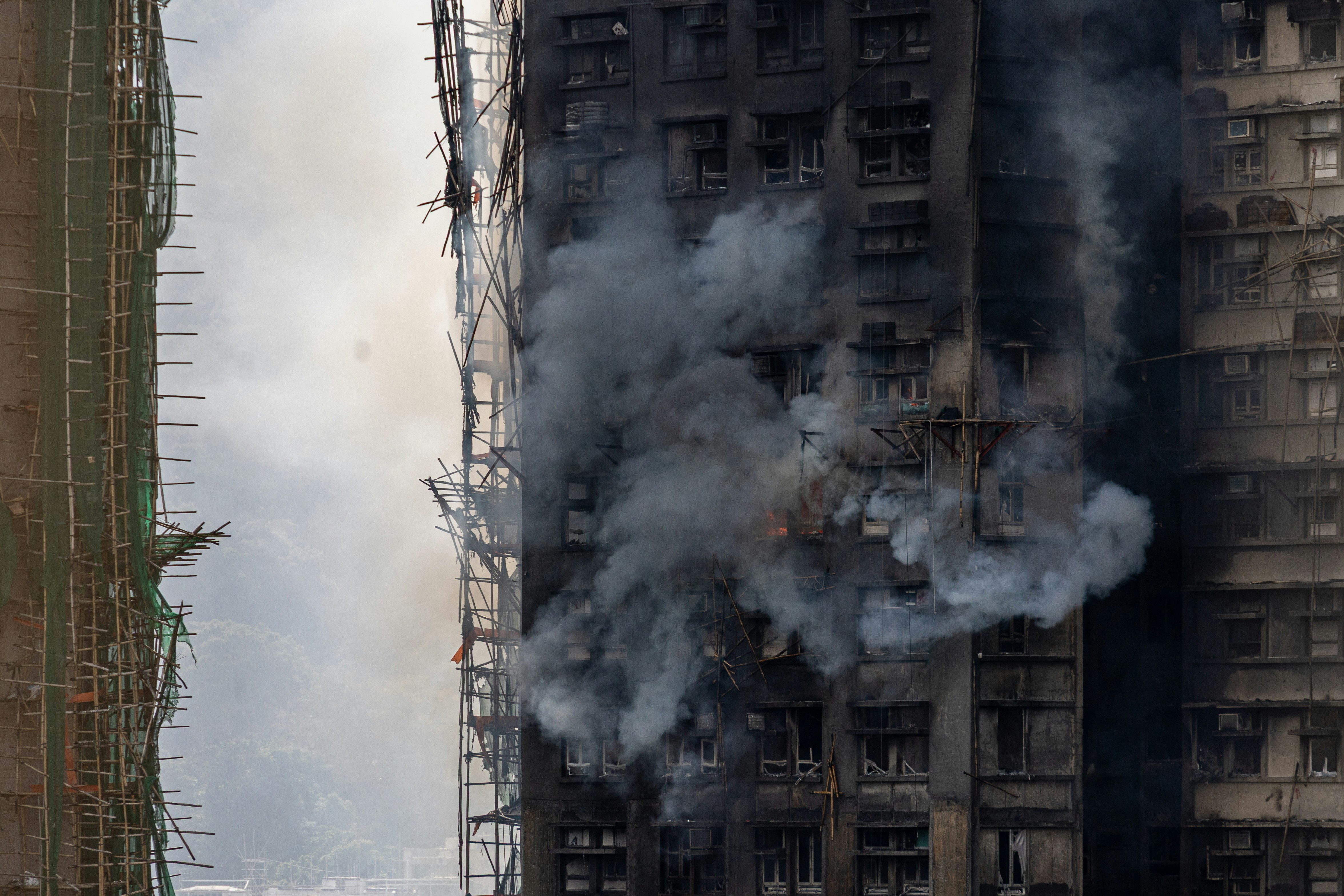 宏福苑大火第三日,大廈仍然冒出白煙。(廖雁雄攝)1 R# V) b7 Q" R' p2 J! N