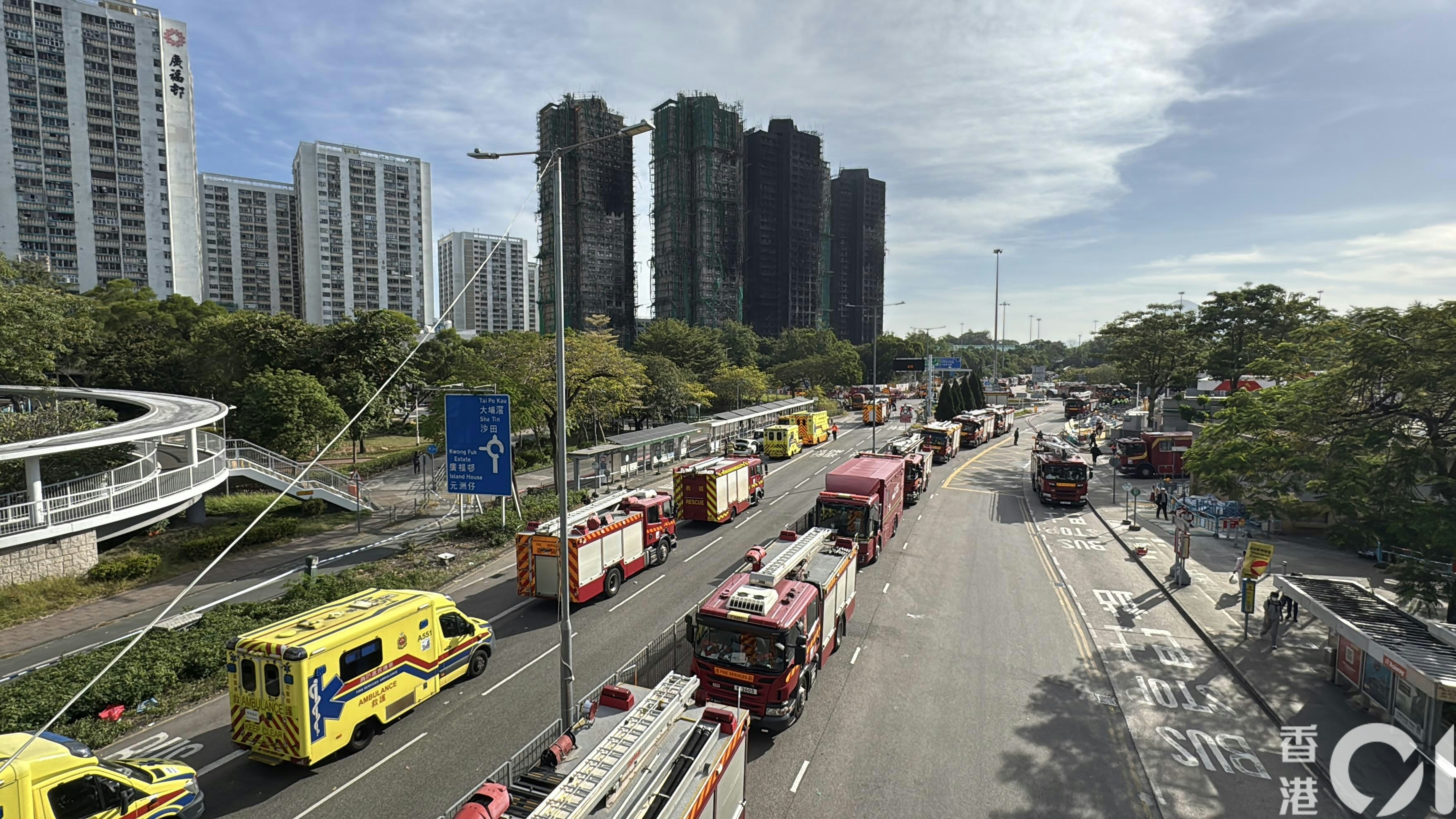 宏福苑火警第三日,大批消防和救護車在場。(翁鈺輝攝)