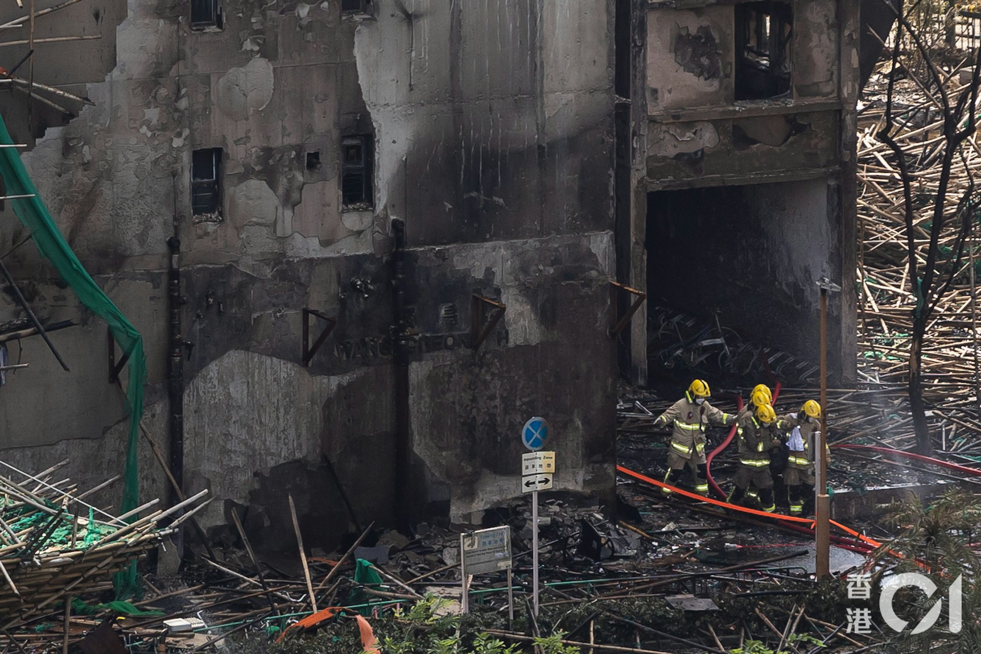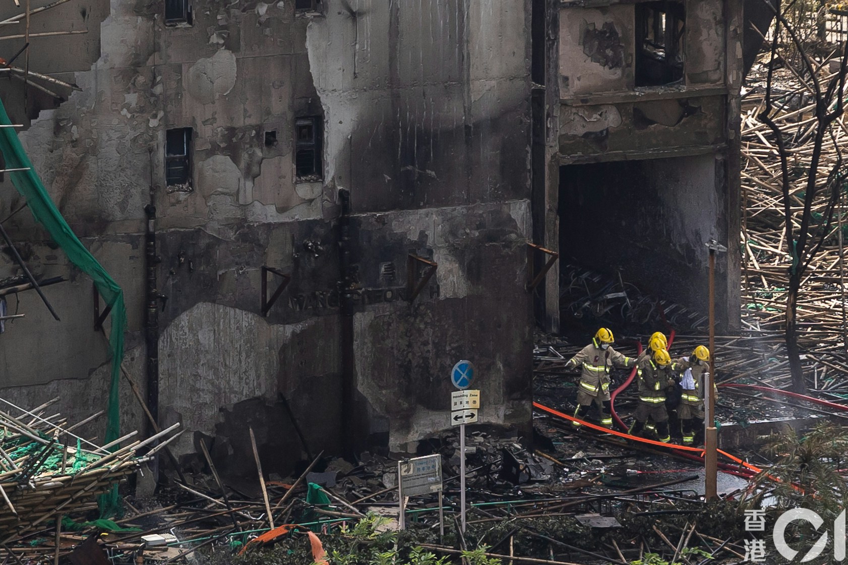 ; f( T0 P: J7 P9 ]& ~ @宏福苑大火第三日,消防員繼續在場搜救。(廖雁雄攝)