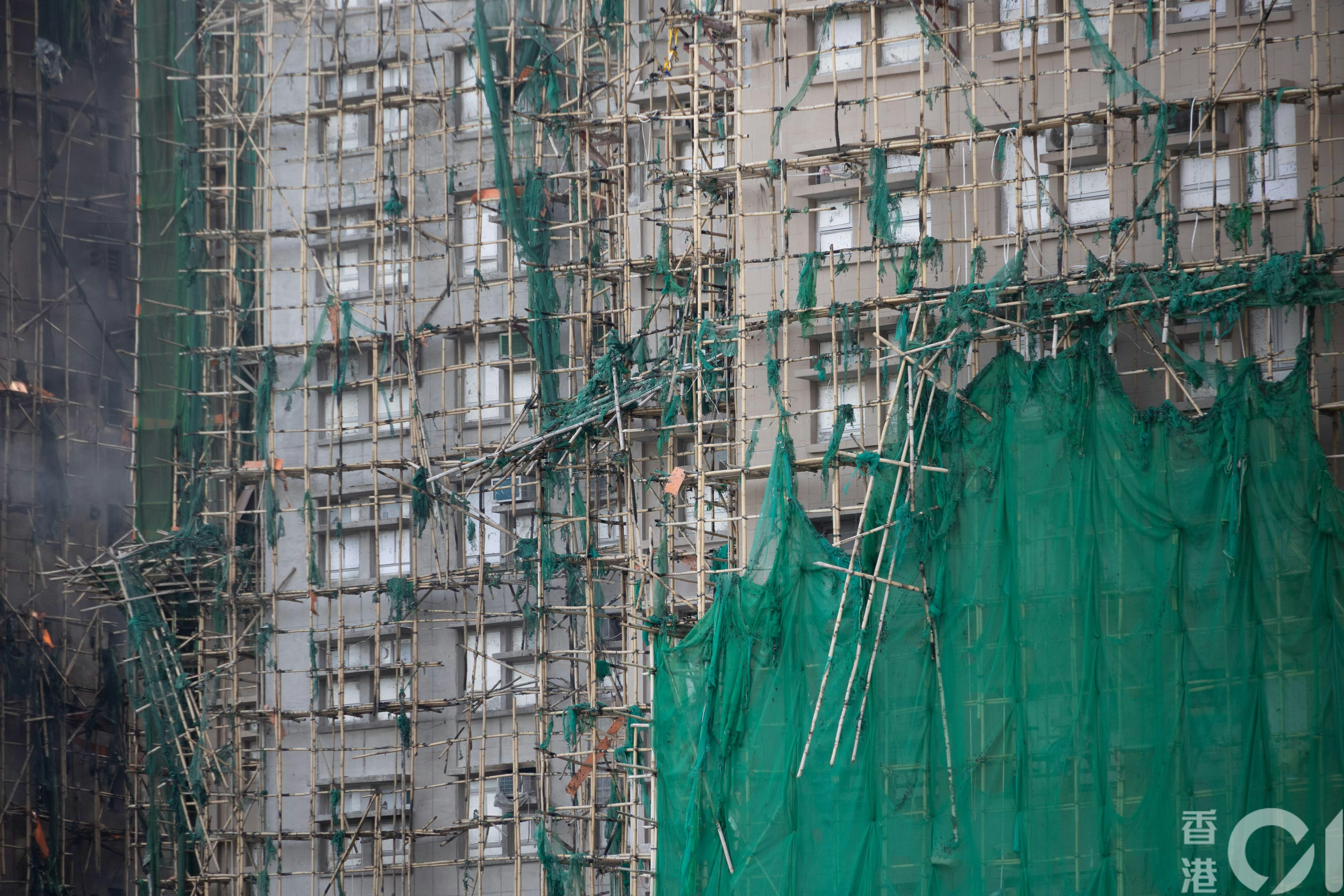宏福苑11月26日發生五級火,外牆棚網燒燬後,可見牆上有不少發泡膠。(梁鵬威攝)