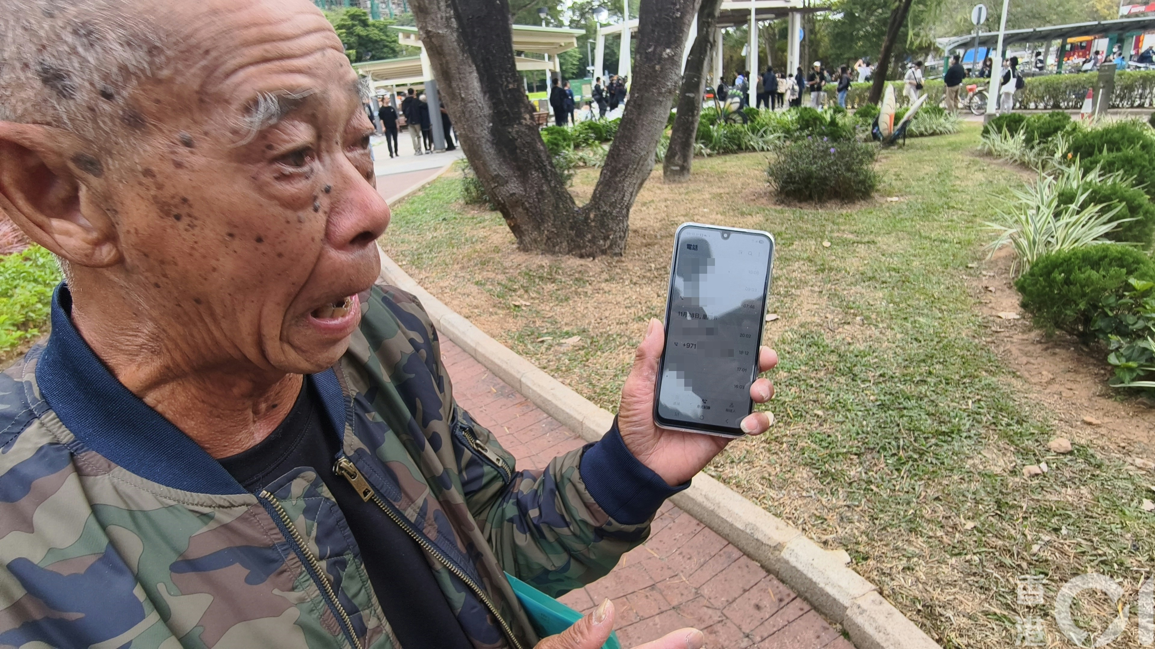 宏福苑大火災民何先生疑遇騙徒,叫對方出示有關證件。對方見事敗,則尷尬回應:「你好醒目喎」。(黃學潤攝)