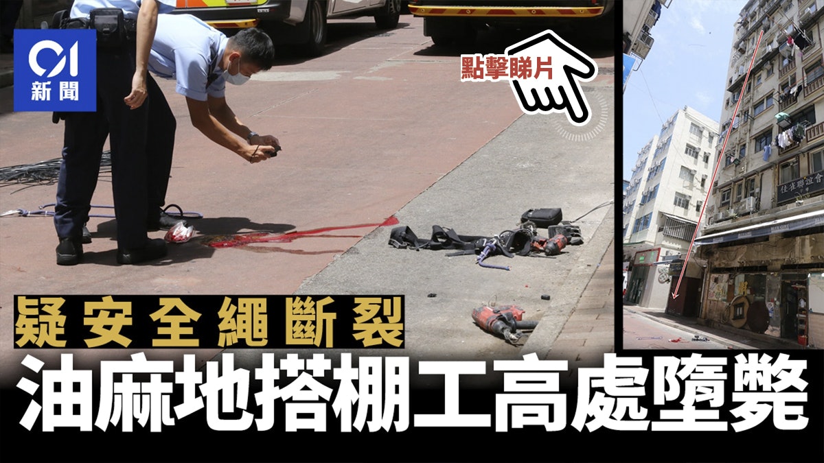 (星島日報報道)油麻地昨晨發生致命工業意外。一名棚工準備在外牆搭棚架時,疑身上安全繩突然斷裂,他由六樓飛墮街中,重傷昏迷,送院搶救不治,遺下年邁雙親境況堪憐,勞工處已發出「暫時停工通知書」,正調查意外原因。2 v) S% h& z: @4 B( t8 f% k