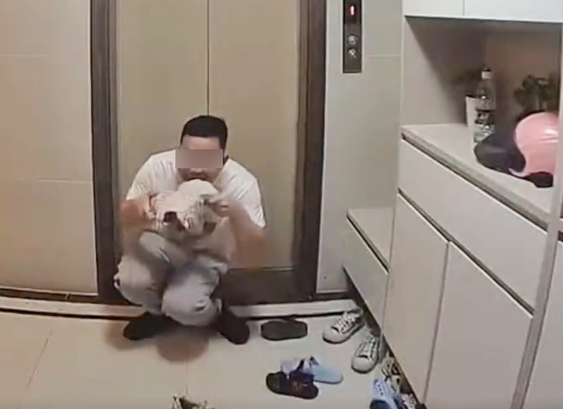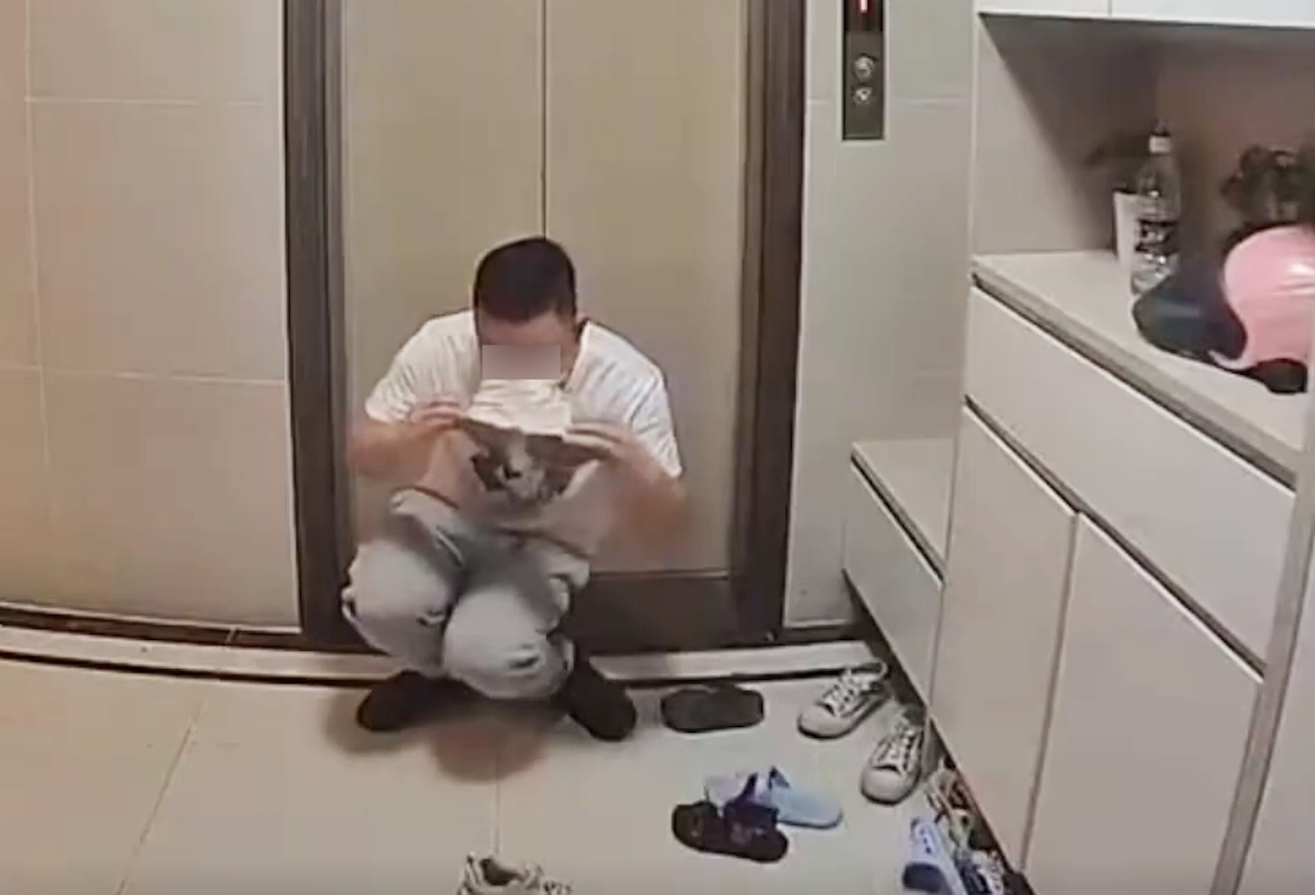 片中地點為肇慶吾悅廣場1個屋苑的樓層大堂,畫面可見1名身穿白衣的男子蹲於其中1單位的門外,拿起1隻女裝白色波鞋,將鞋筒放近鼻子旁邊嗅聞。(微博影片截圖)