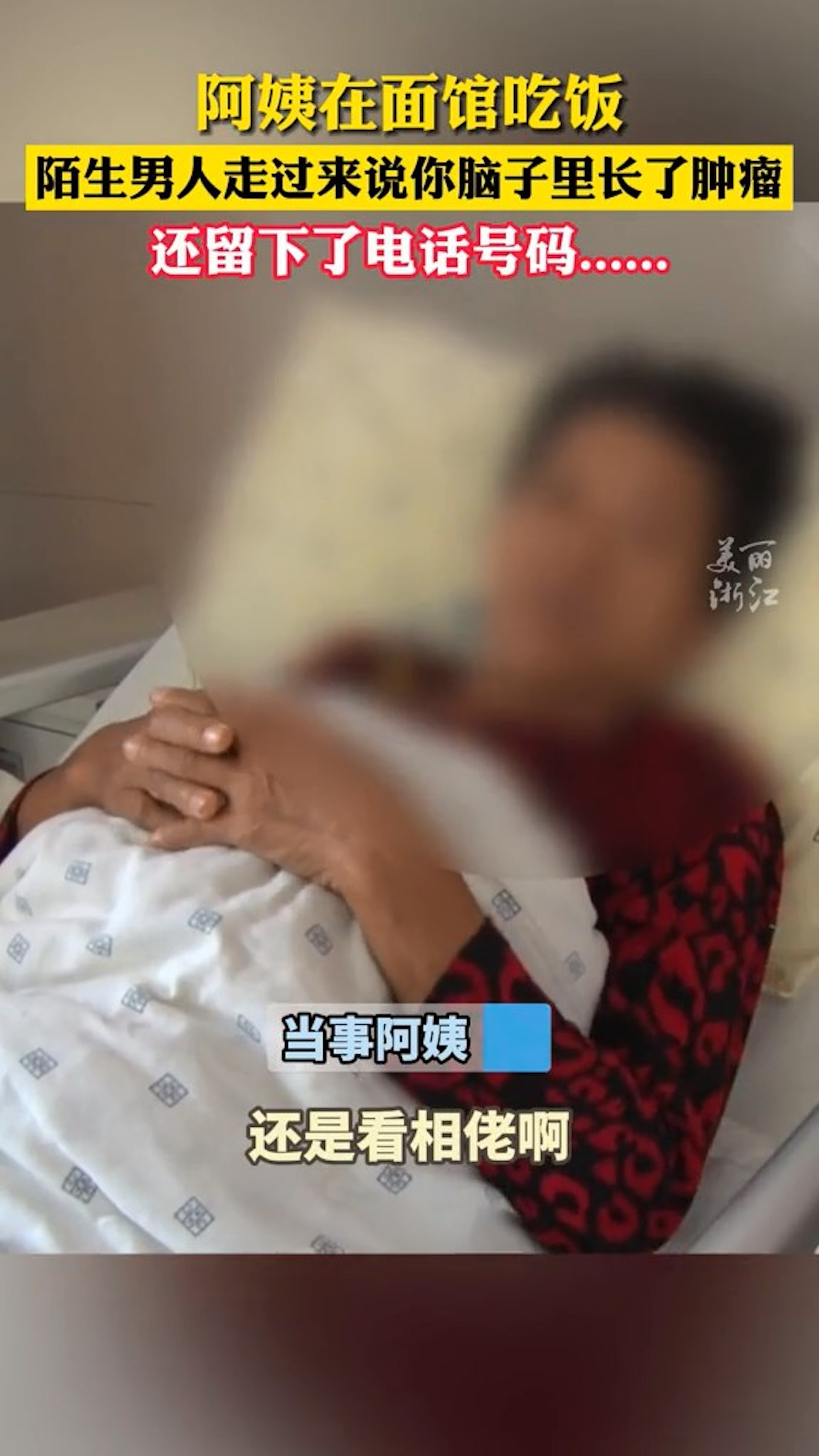 綜合內地媒體報道,浙江紹興1名女子於麵館吃麵時,1名陌生男子突然走近對她說「妳腦子裏面可能長了腫瘤」,勸她快到醫院檢查,並留下聯絡電話號碼,「(陌生男)走過來,說臉色更改過了,我當時在想你認識我嗎?還是看相佬啊?」。TVBNOW 含有熱門話題,最新最快電視,軟體,遊戲,電影,動漫及日常生活及興趣交流等資訊。) d. M3 r* I8 S2 [0 o. p